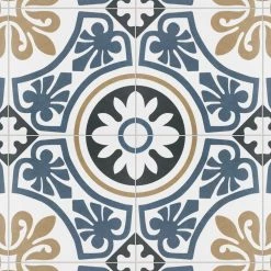 Old-world European elegance radiates from the Merola Tile Majestic Tiena Blue Encaustic 9-3/4 in. x 9-3/4 in. Porcelain Floor and Wall Tile. The glazed surface offers durability and ease of maintenance, for a beautiful floor that is easy to care for. When placed together these tiles create a striking pattern in shades of dark charcoal, denim blue, deep chartreuse, and snow white, with a flourish of vines and floral shapes to create a vibrant cement look. These tiles are perfect for any heavy-duty indoor or outdoor room where you want to create a statement look.