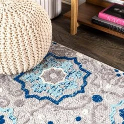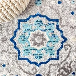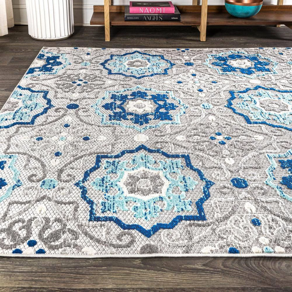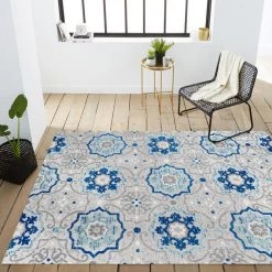 Inspired by the tile floors of Italy and Morocco, this flatweave rug adds rich pattern underfoot. Ogee curves, and medallions in shades of blue and dance against a neutral khaki ground. The pet-friendly and kid-proof flatweave design makes it easy to clean.