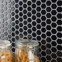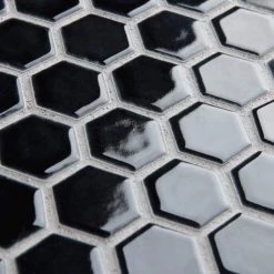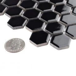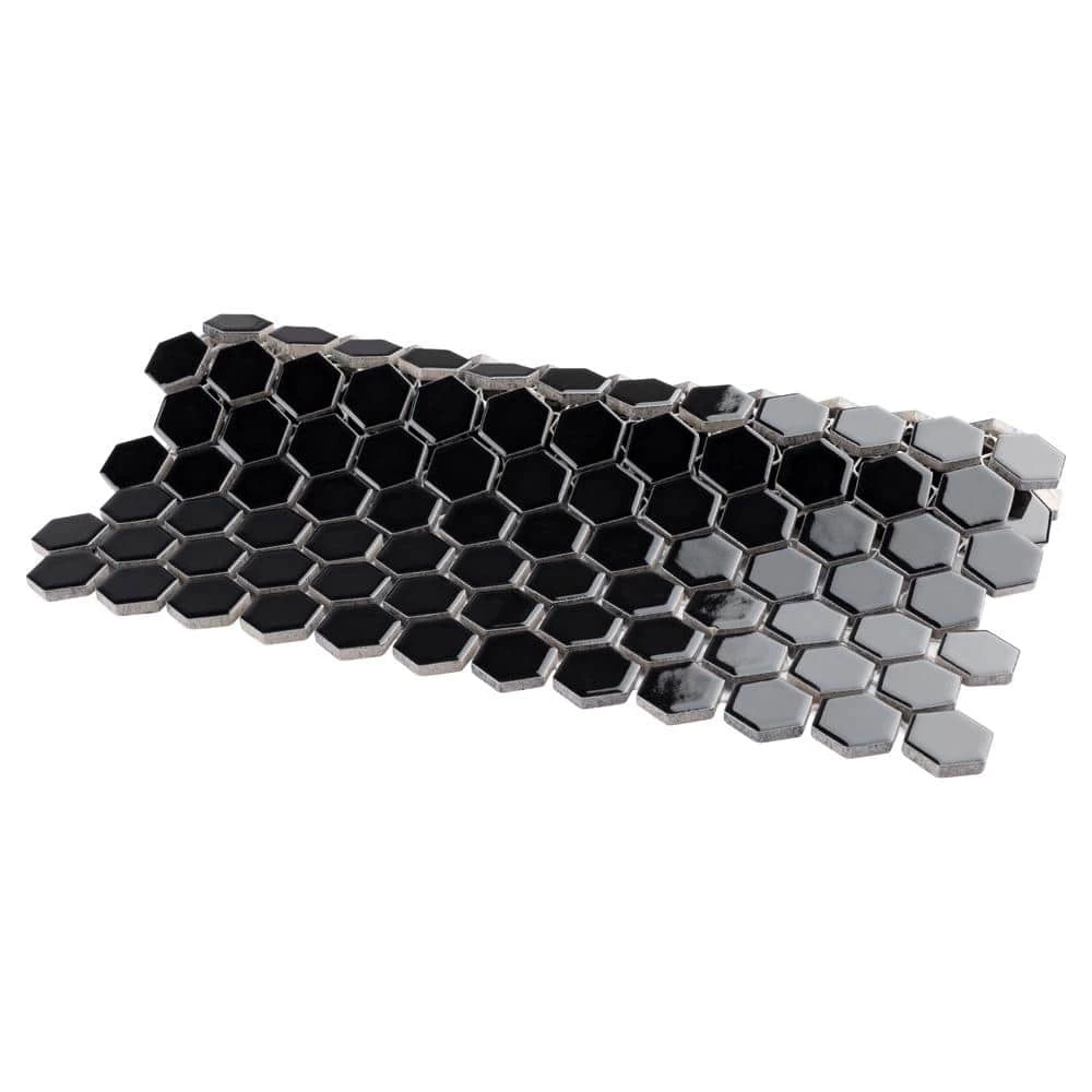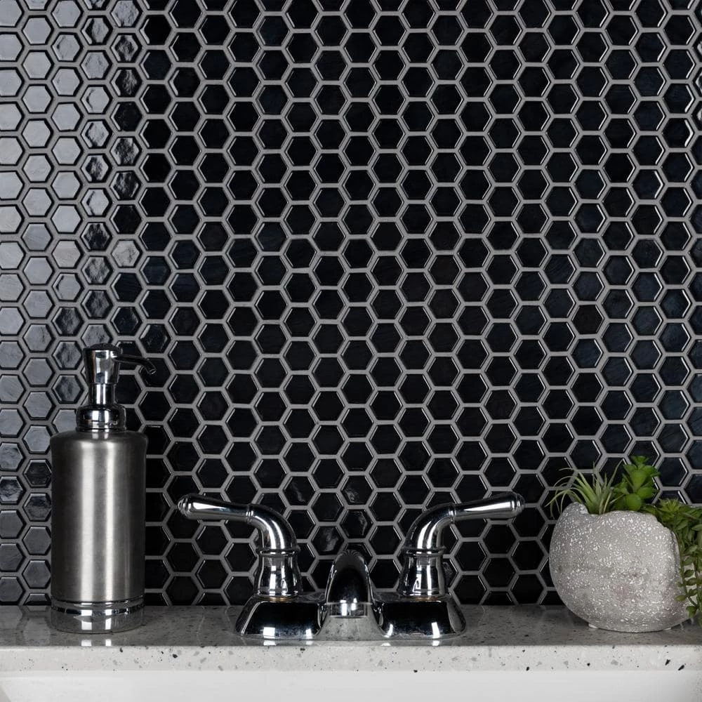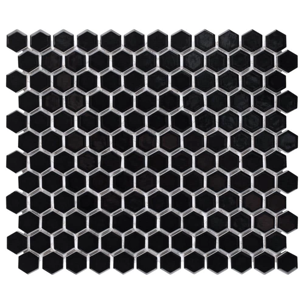 Transform your space into a tribute to retro design with our Metro Hex Glossy Black 10-1/4 in. x 11-7/8 in. Porcelain Mosaic Floor and Wall Tile. As a modern deviation from the classic hexagon mosaic, this tile option is a throwback to traditional retro design with a contemporary feel. Glossy black hexagons are precisely arranged on an interlocking mesh to create a seamless installation. This minimalistic geometric porcelain mosaic is unique yet simplistic enough to integrate into any design, ranging from traditional style renovations to modern home projects. Its impervious and frost-resistant features make this an ideal tile for both indoor and outdoor residential use, including backsplashes, bathrooms, showers and kitchens. This tile is a perfect choice on its own or paired with other products in the Metro Hex Collection. Tile is the better choice for your space. This tile is made from natural ingredients, making it a healthy choice as it is free from allergens, VOCs, formaldehyde and PVC.