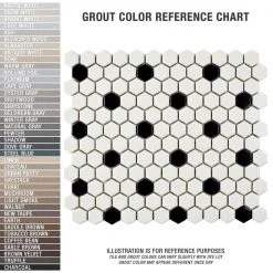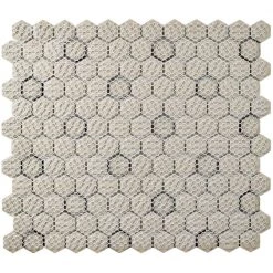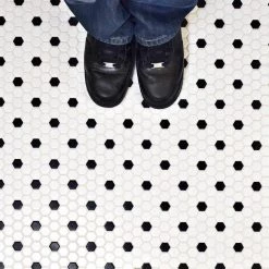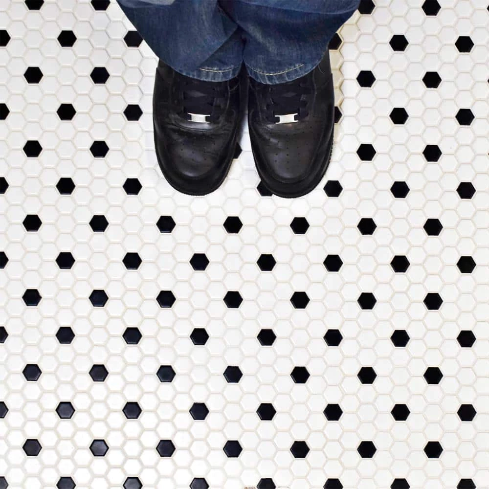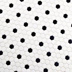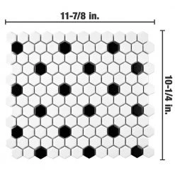 The Merola Tile Metro Hex Matte White with Black Dot 10-1/4 in. x 11-7/8 in. Porcelain Mosaic Tile features a smooth, satin glazed finish to help add style to your decor. This beautiful tile has water absorption of less than 0.5% and a matte white color with a black dot accent to coordinate with many interior decors. Designed for residential floors, this porcelain tile is frost resistant for indoor or outdoor applications to suit your needs. If pairing with other products in our Metro Hex series, please consider that all formats and thicknesses may not be the same.