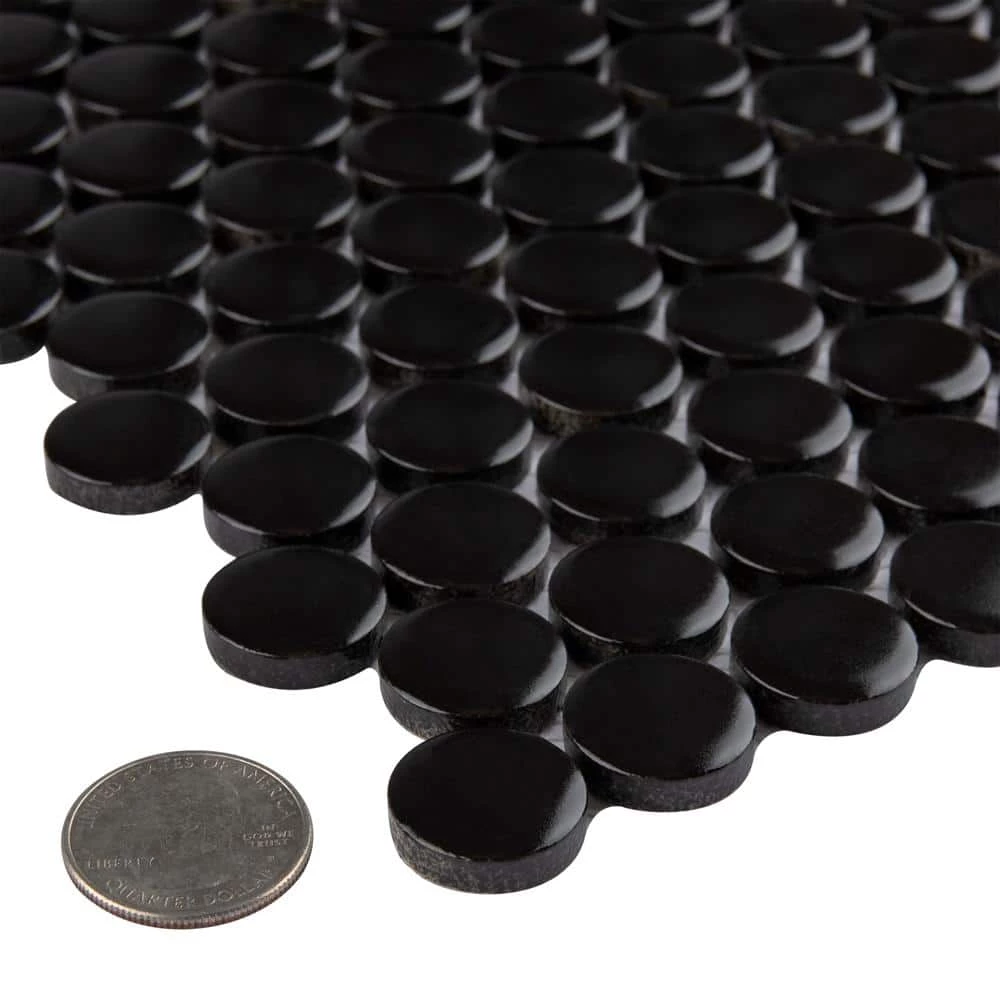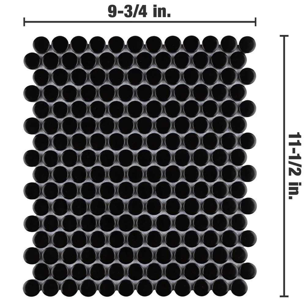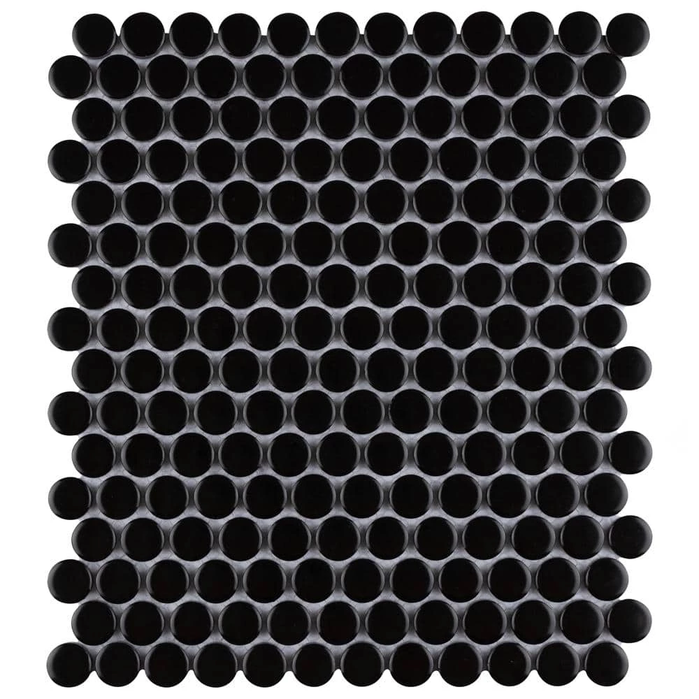 Transform your space into a tribute to retro design with our Metro Penny Matte Satin Black 9-3/4 in. x 11-1/2 in. Porcelain Floor and Wall Mosaic Tile. As a modern deviation from the classic mosaic, this fresh option is a throwback to traditional retro design with a contemporary feel. Matte black penny rounds are arranged on an interlocking mesh to create a seamless installation. This minimalistic geometric porcelain mosaic is unique yet simplistic enough to integrate into any design, ranging from traditional style renovations to modern home projects. Its ADA compliant, impervious and frost resistant features make this an ideal tile for residential indoor and outdoor use, including backsplashes, bathrooms, and kitchens. Tile is the better choice for your space. This tile is made from natural ingredients, making it a healthy choice as it is free from allergens, VOCs, formaldehyde and PVC.