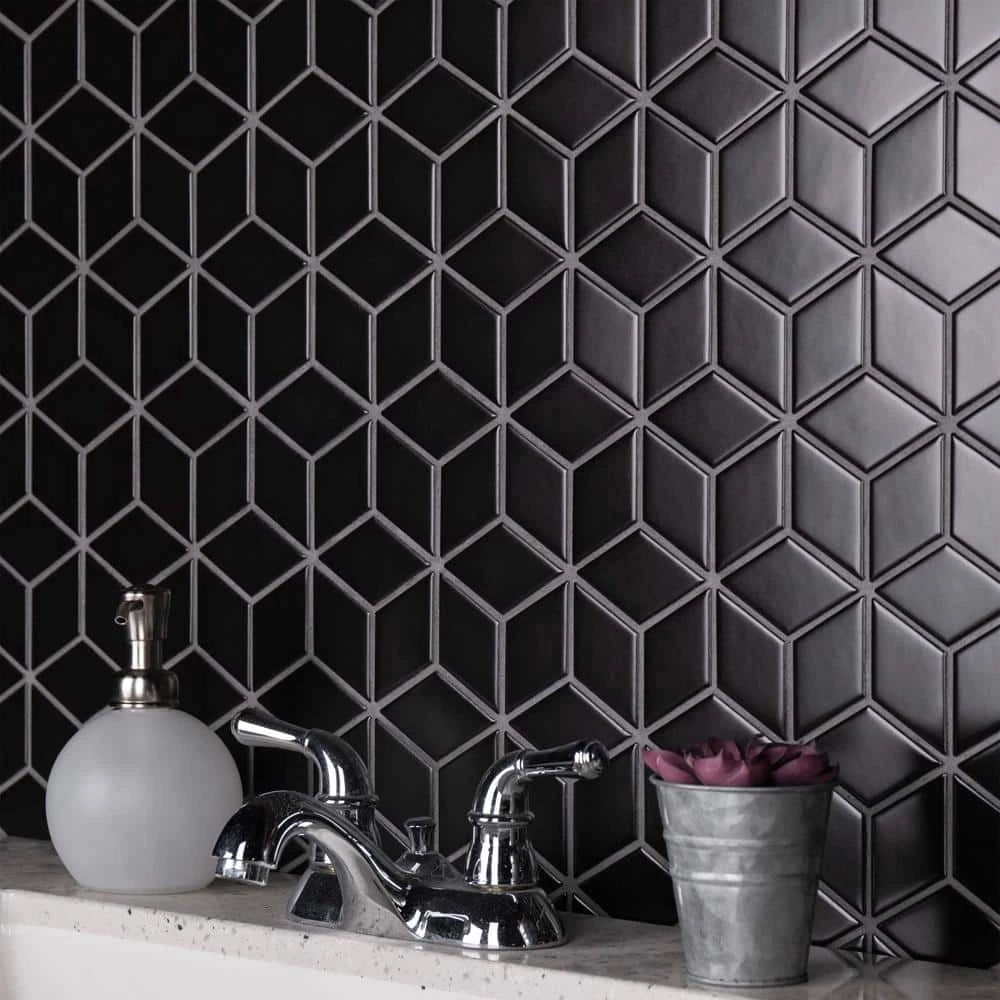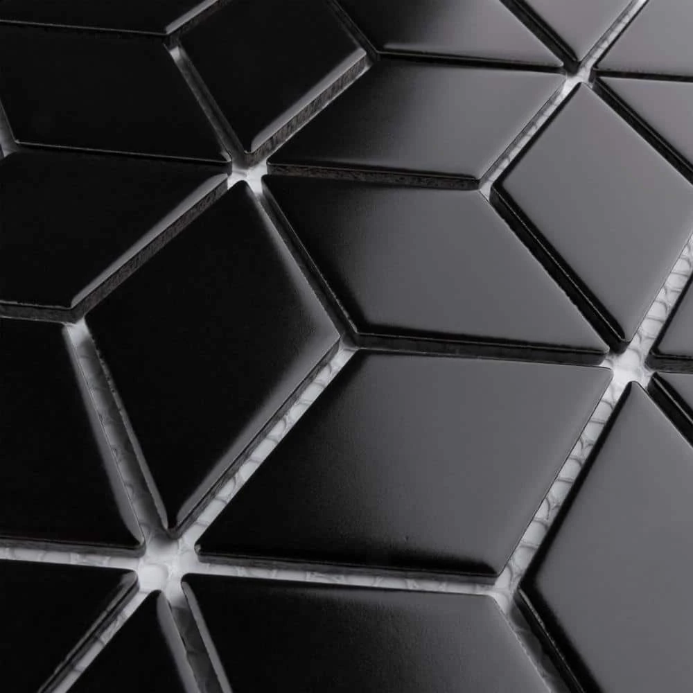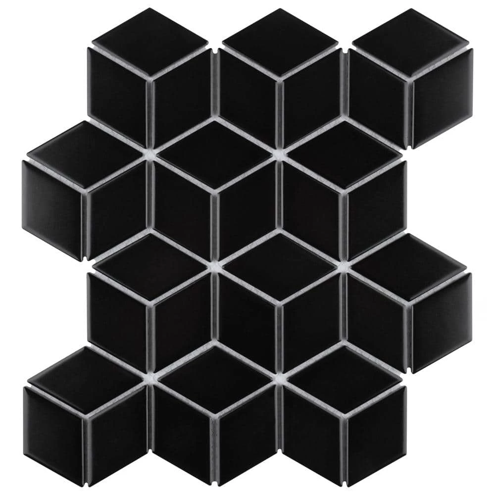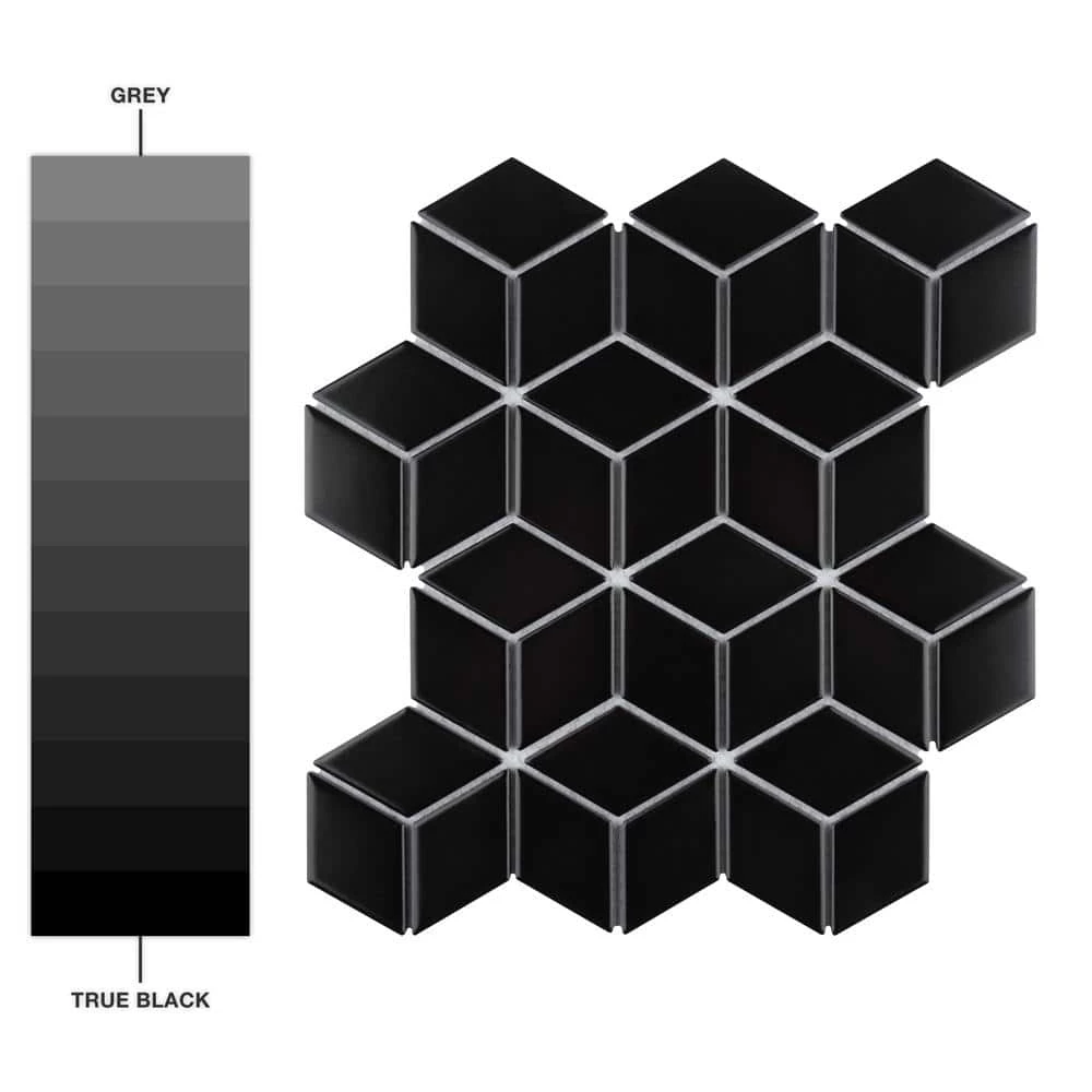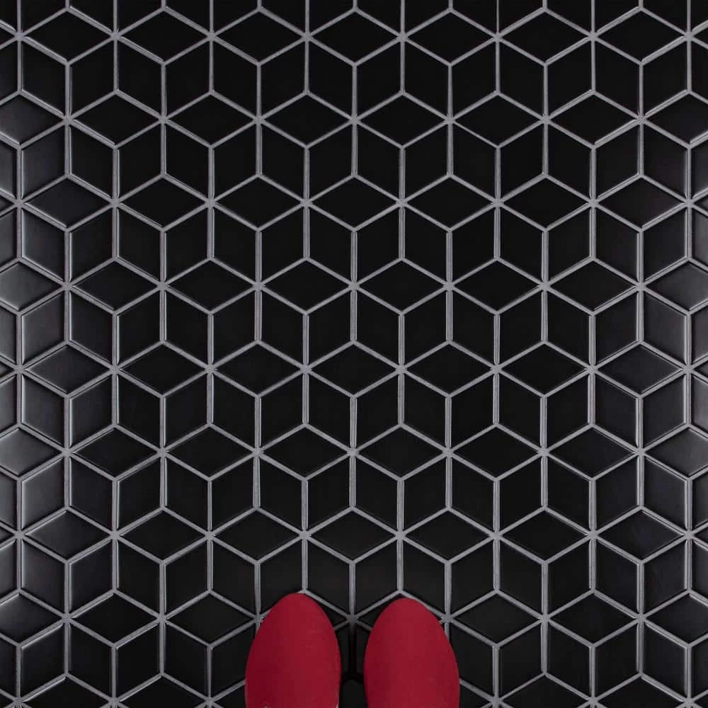 Our Metro Rhombus Matte Black 10-1/2 in. x 12-1/8 in. Porcelain Mosaic Floor and Wall Tile instantly elevates spaces through a refreshing dose of geometric design. As an innovative twist on the classic mosaic, this product is comprised of diamond shaped chips in black with a smooth surface. Matte diamonds are arranged on an interlocking mesh to create a seamless installation. This minimalistic geometric porcelain mosaic is unique yet simplistic enough to integrate into any design, ranging from traditional style renovations to modern home projects. Its impervious and frost-resistant features make this an ideal tile for both indoor and outdoor residential use, including backsplashes, bathrooms, showers and kitchens. This tile is a perfect choice on its own or paired with other products in the Metro Rhombus Collection. Tile is the better choice for your space. This tile is made from natural ingredients, making it a healthy choice as it is free from allergens, VOCs, formaldehyde and PVC.