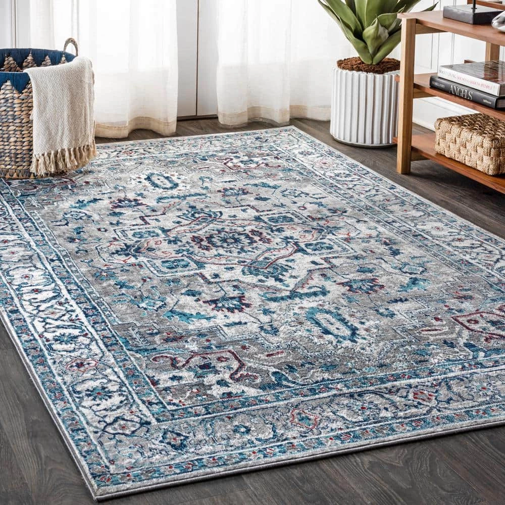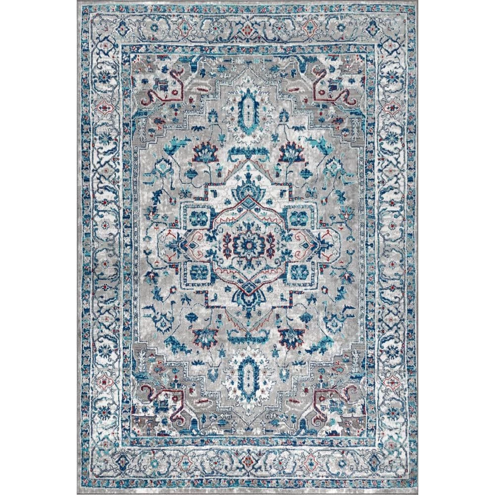 - Neutral gray is enlivened with accents of turquoise and plum in this traditional area rug