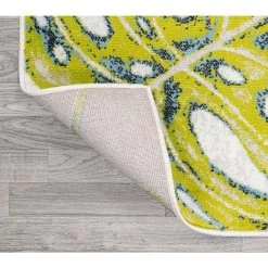 Whether you live in a Bohemian jungalow cottage or just love resort style, the all-lover leaf pattern of this rug brings the jungle vibe home. This unique tropical rug features monstera and palm branches in a lively scattered design. The pet-friendly and kid-proof flat weave makes it easy to clean.