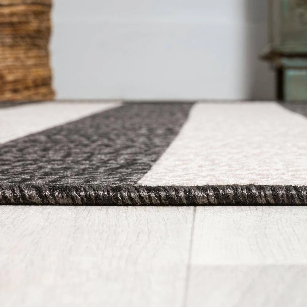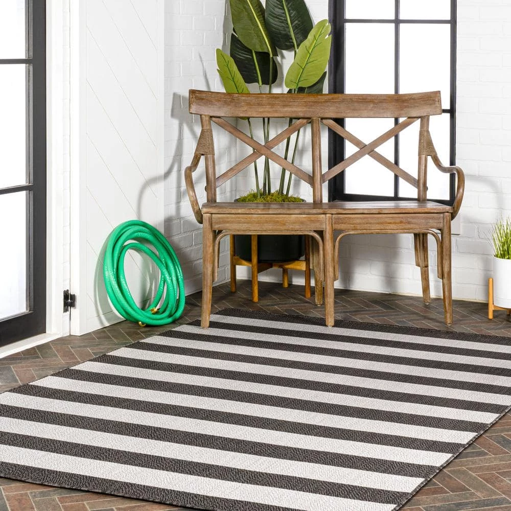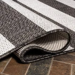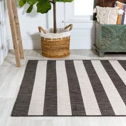 Bring home a timeless stripe rug for your modern cottage, beach bungalow or farmhouse. Our durable low pile rug features wide, woven stripes in two contrasting colors. Add graphic punch to your living room, dining room, bedroom, or porch with this easy-care, family-friendly rug.