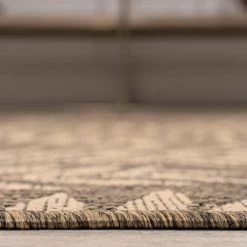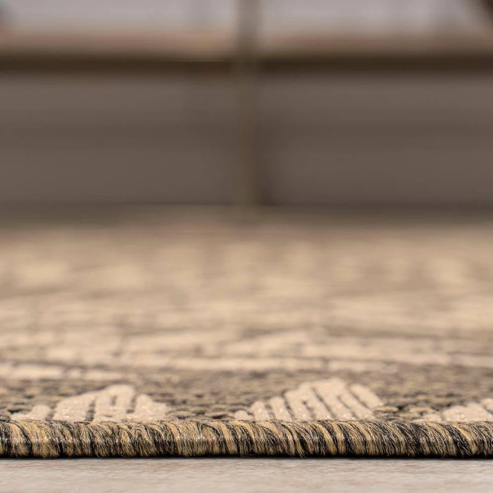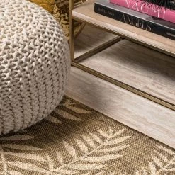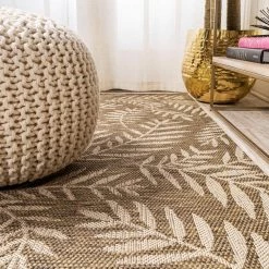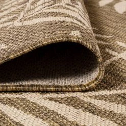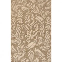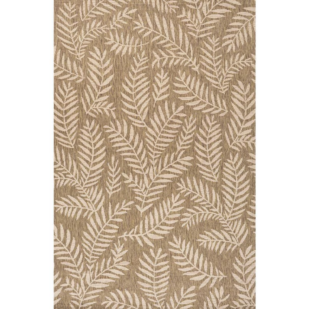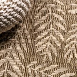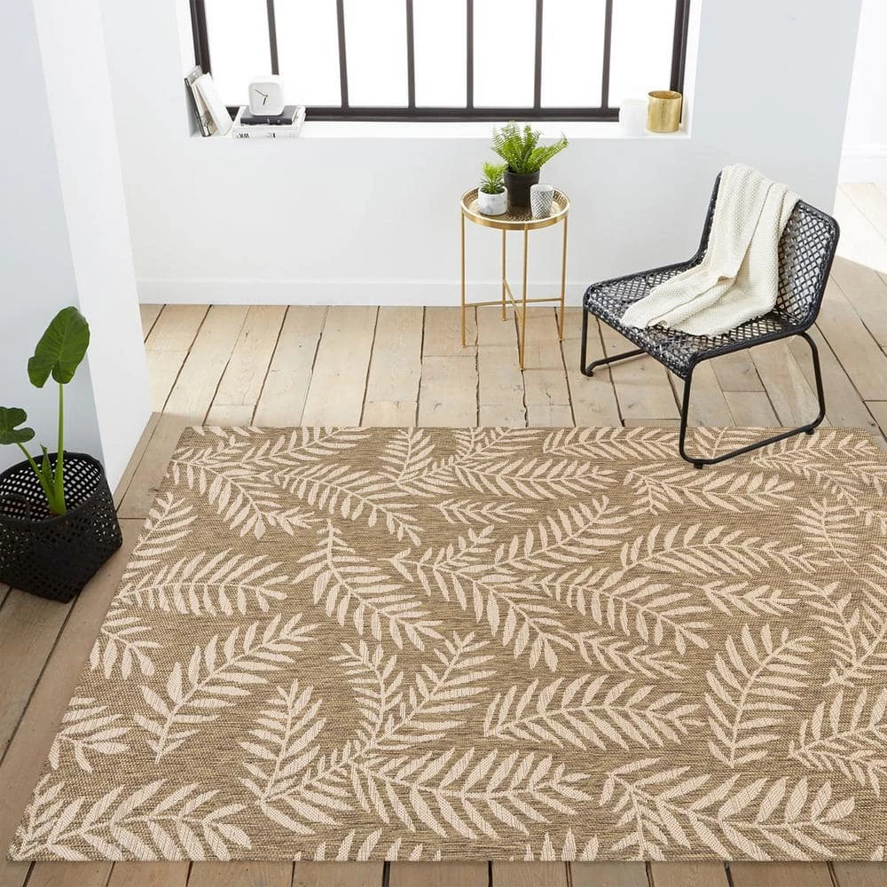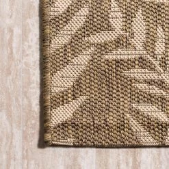 Whether you live in a tropical beach retreat or just love jungalow style, the allover palm frond pattern of this rug brings the jungle home. Scattered palm tree branches create graphic contrast in rich brown and cream tones. The busy pattern is perfect for your tropical patio, entry, kitchen, hallway, living room or bedroom. The pet-friendly and kid-proof flatweave design makes it easy to clean, and perfect for the beach house.