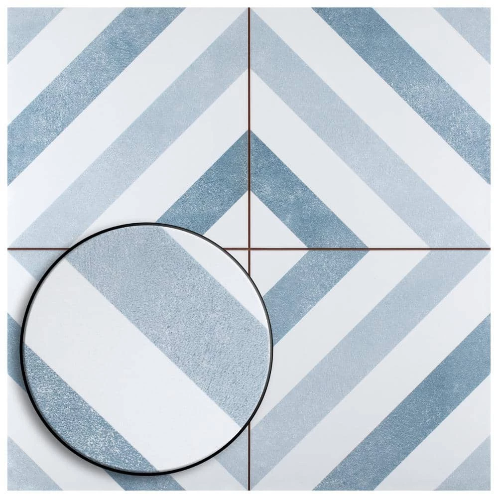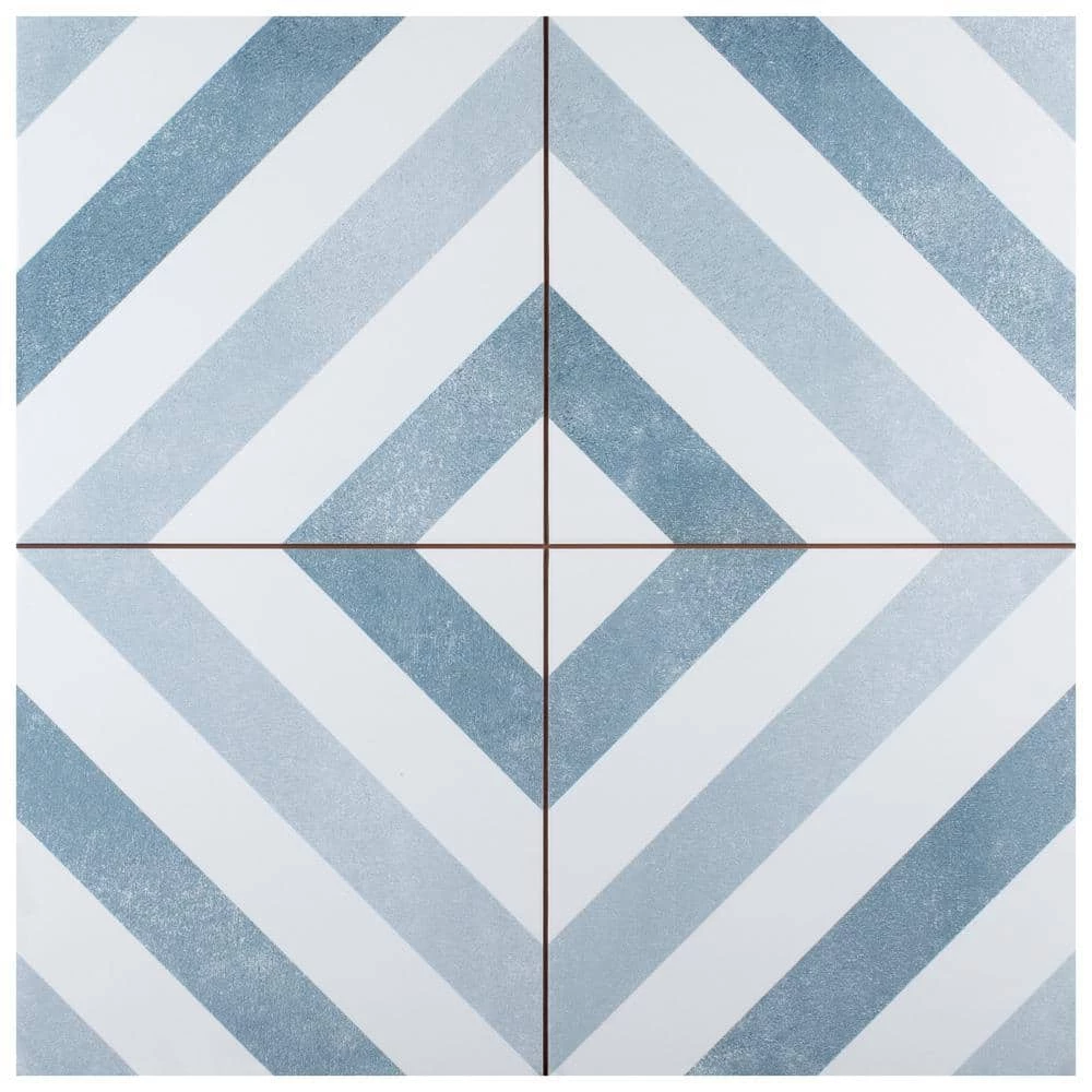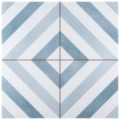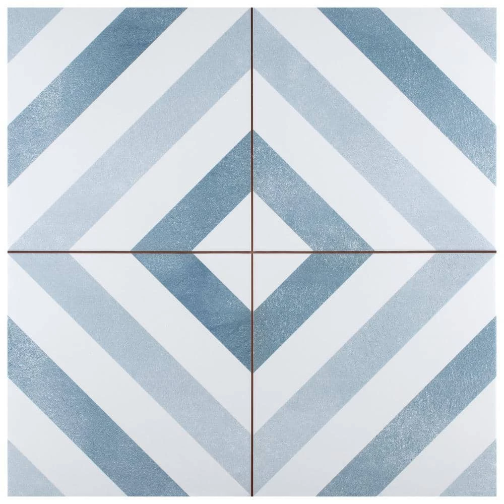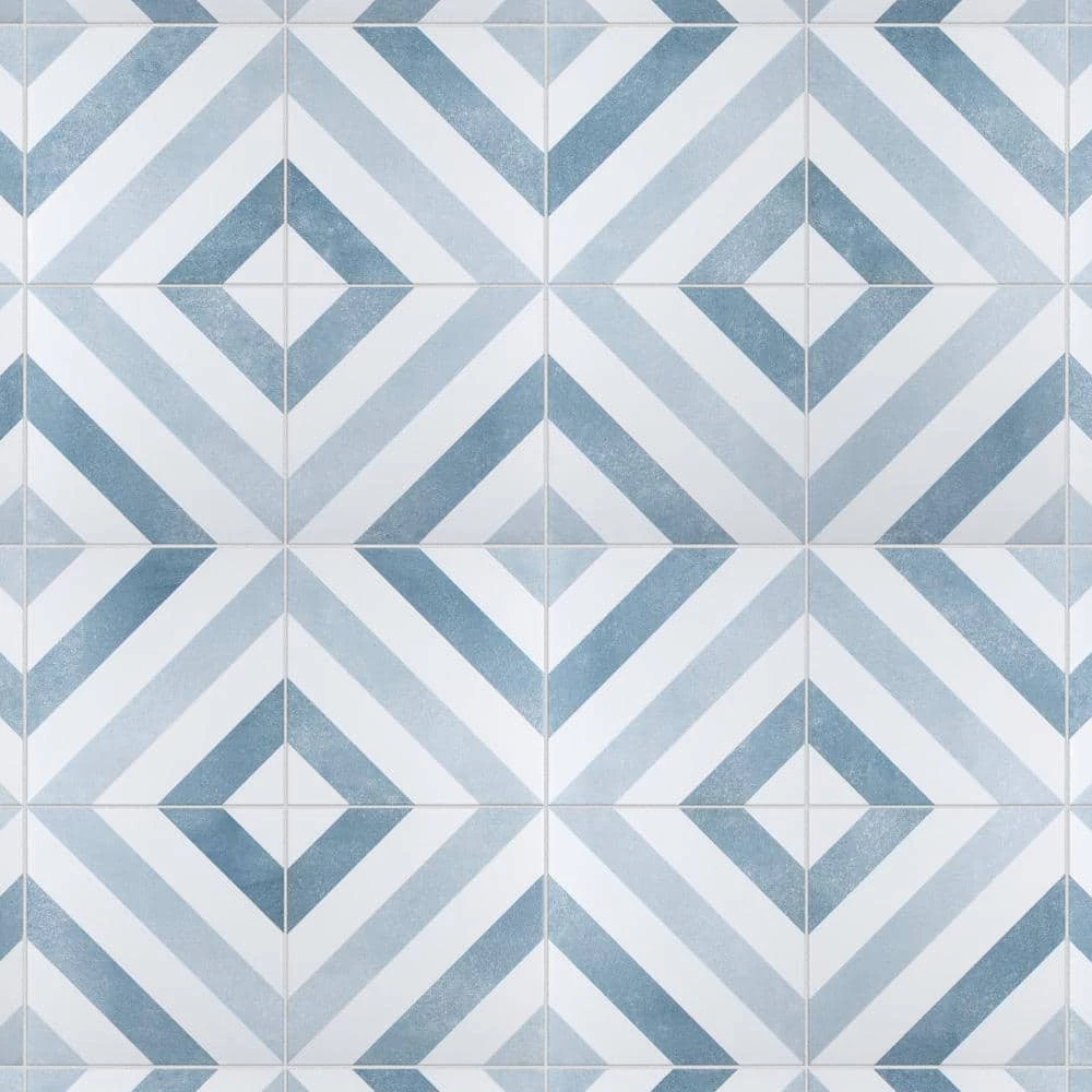 Our Merola Tile Opticks Encaustic 17-5/8 in. x 17-5/8 in. Ceramic Floor and Wall Tile offers an encaustic-inspired look. The low-sheen glaze features faded, bold geometric patterns in hues of light blue. This tile consists of a union of slanted lines that converge at the center to create an alluring diamond pattern. Use this durable tile as a lively accent for a variety of indoor floor and wall installations, including kitchens, bathrooms and entryways. Save time and labor spent arranging smaller square tiles and instead install these durable ceramic slabs, which have 4 squares separated by scored grout lines. Tile is the better choice for your space. This tile is made from natural ingredients, making it a healthy choice as it is free from allergens, VOCs, formaldehyde and PVC.