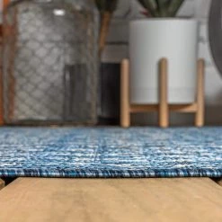 With its geometric design inspired by Moroccan tribal patterns, our Boho-chic rug adds eclectic style to an outdoor porch or patio. Varied tones of deep blues mingled with a light gray pattern give this rug a hand-woven, vintage vibe. The flatweave design is great for high-traffic spaces indoors too.