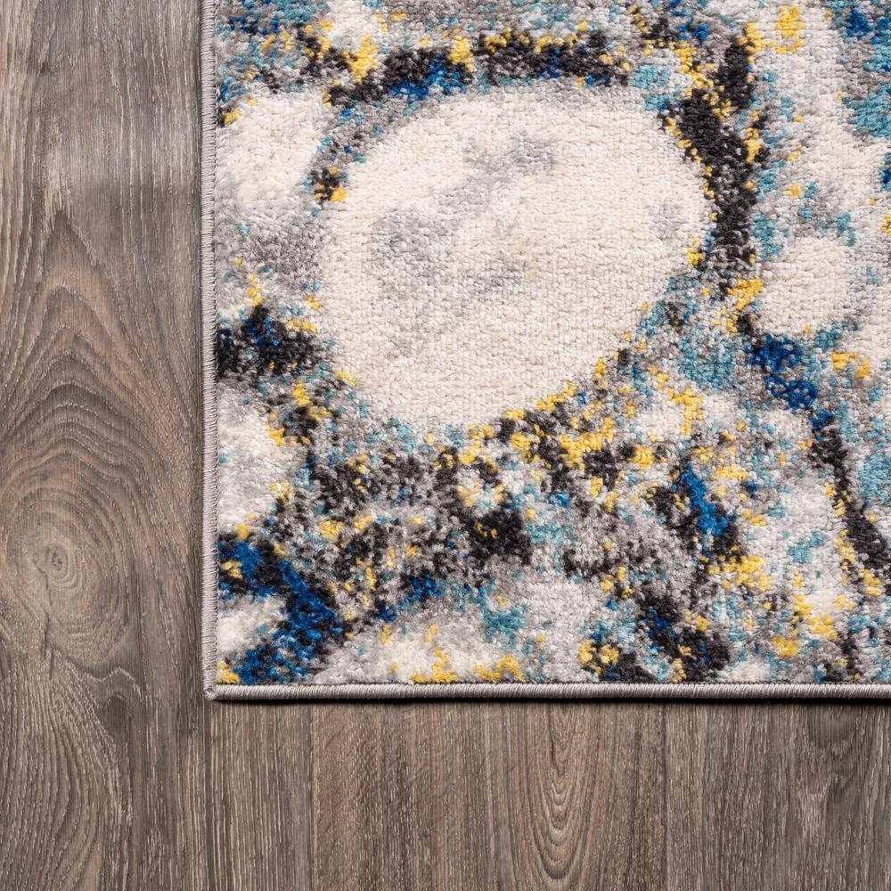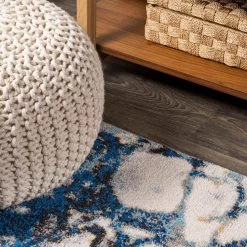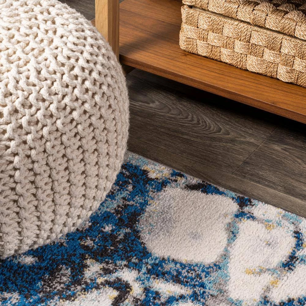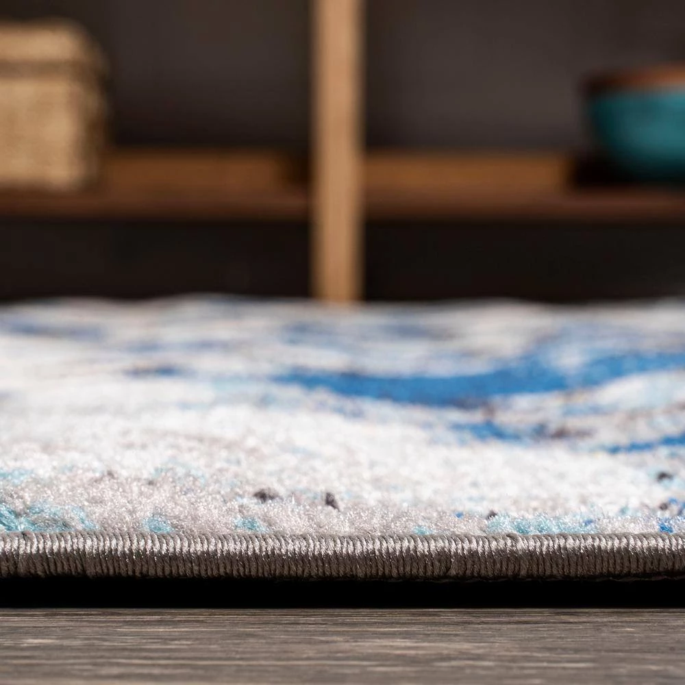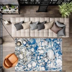 Inspired by the colorful abstract designs of marbled papers, this bold rug has a modern, coastal vibe. Deep blue and accents of gold swirl around pebble-gray elements. This unique rug’s overall pattern makes it perfect for homes with kids and pets. It’s the perfect centerpiece for a mid-century modern, contemporary, beach house or minimalist interior.
