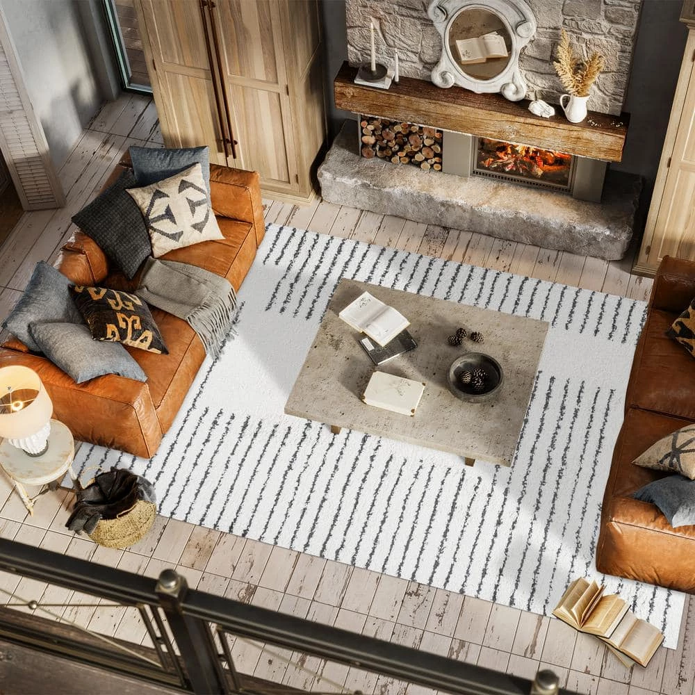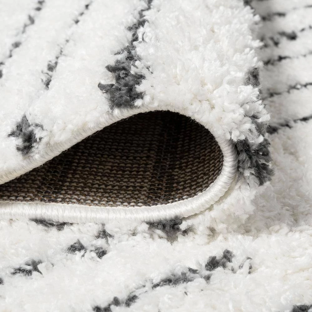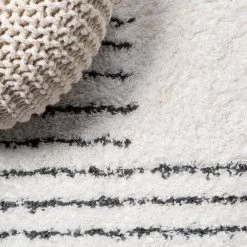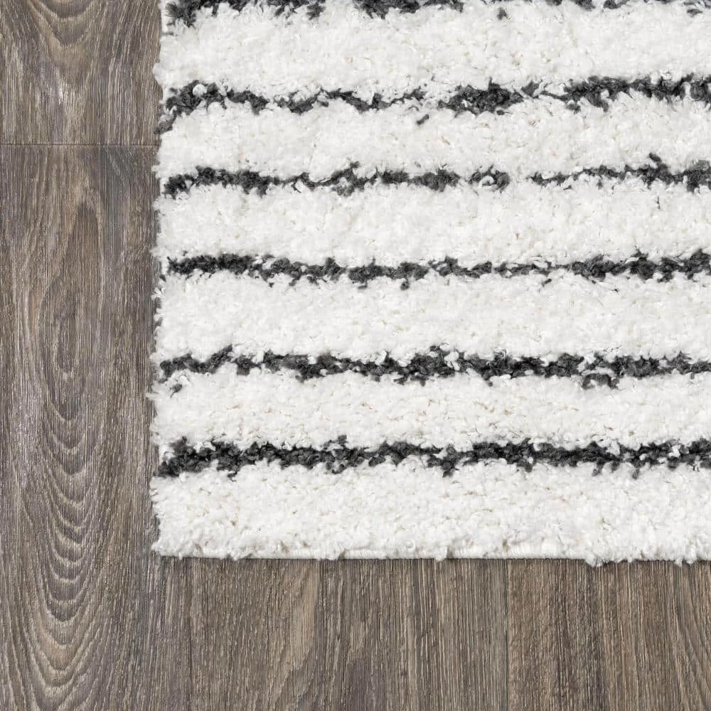 Inspired by Moroccan rugs, our modern striped rug has a soft, low shag pile. The geometric pattern is woven in black on an ivory background; our offset stripe design has mid-century flair. Add some graphic punch to your living room, bedroom, or reading nook with this easy-care rug.