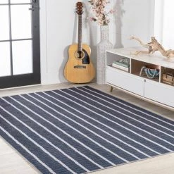 A classic stripe rug gets a distressed look for rustic style in a modern cottage or farmhouse. Woven stripes have strie’ details for a handwoven effect. This durable, machine washable rug adds graphic punch to a living room, dining room, bedroom, or kitchen.