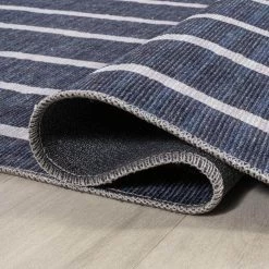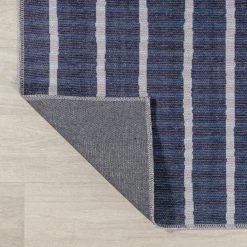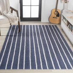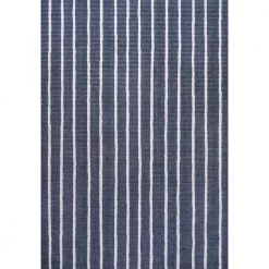 - Distressed stripes have mingled navy and ivory fibers for a handwoven look
