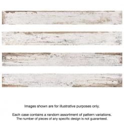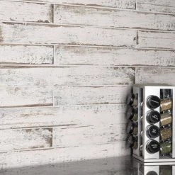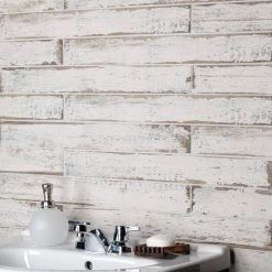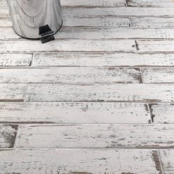 Bring new life to your home with the Merola Tile Retro Blanc 2-3/4 in. x 23-1/2 in. Porcelain Floor and Wall Tile. Crafted in Spain, this partially handmade tile offers the look of real wood with the durability of porcelain. Imitation scuffs and spots create the look of distressed, painted wood. The white glaze features detailed grain accentuated in gray. Each case has 12 variations of pattern arrangements randomly scattered throughout it creating a unique look. This impervious, heavy-duty tile is ideal for indoor and outdoor use, including floors, walls and patios.
