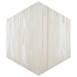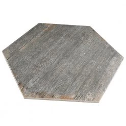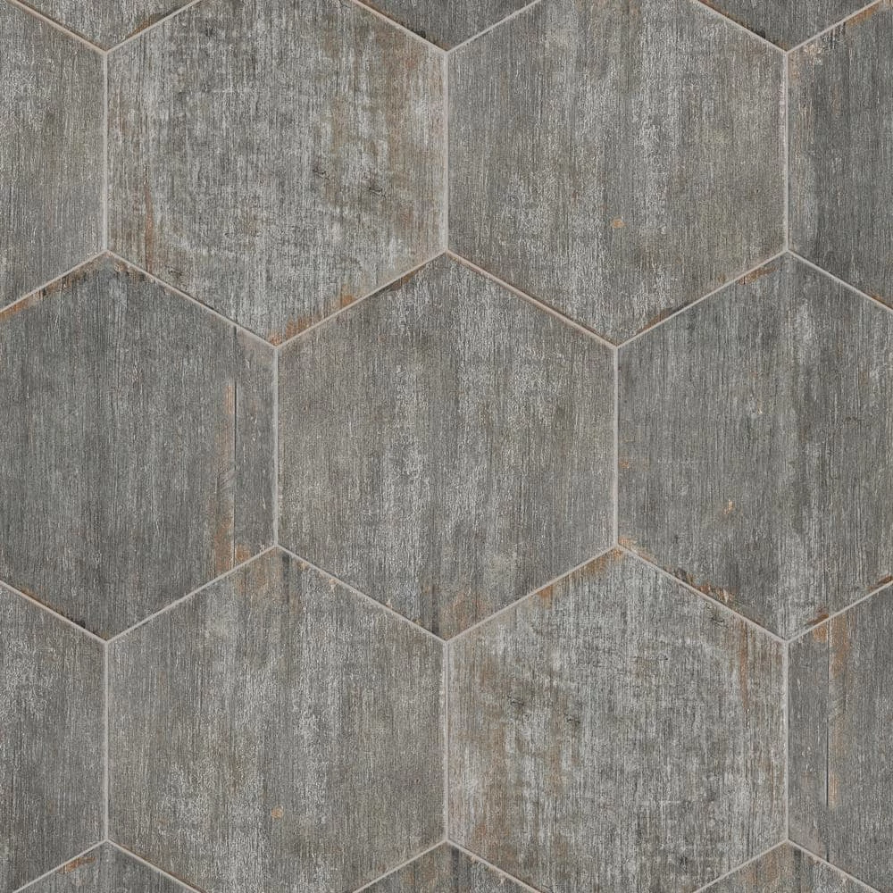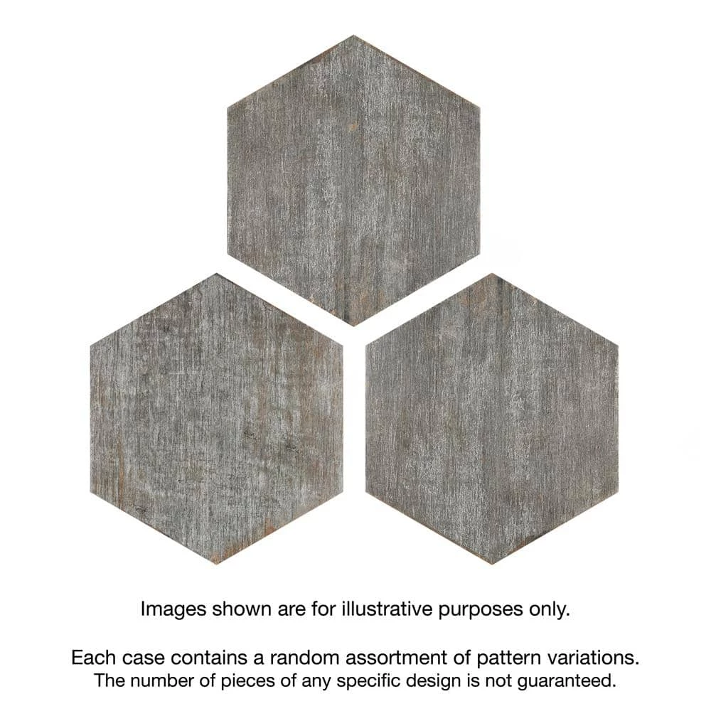 Add a retro touch to your home with the Merola Tile Retro Hex Cendra 14-1/8 in. x 16-1/4 in. Porcelain Floor and Wall Tile. Crafted in Spain, this partilly handmade tile offers the look of real wood with the durability of porcelain. Imitation scuffs and spots create the look of distressed, painted wood. The smoke gray glaze features detailed grain accentuated in rich ochre shades. Each case has 12 variations of pattern arrangements randomly scattered throughout it, creating a unique look. This impervious tile is ideal for indoor and outdoor use, including floors, walls and patios.
