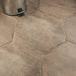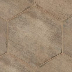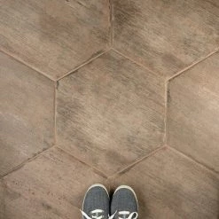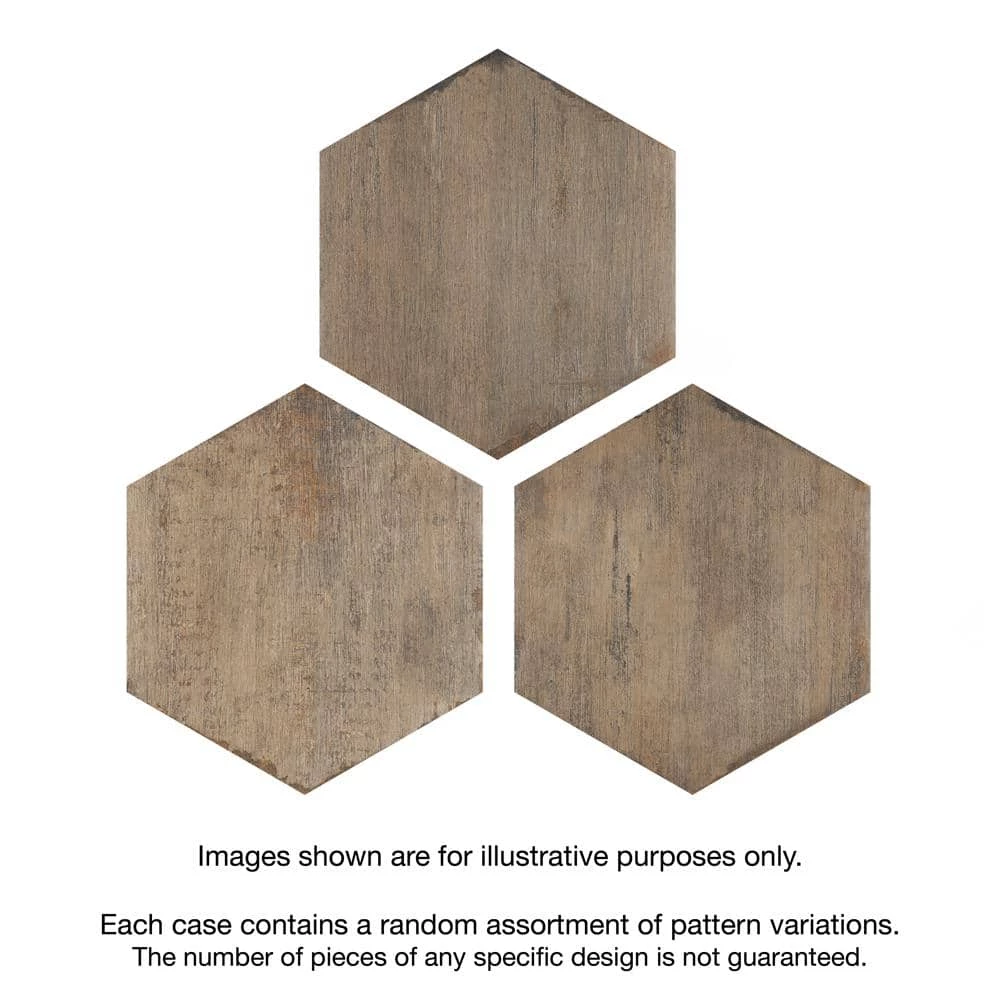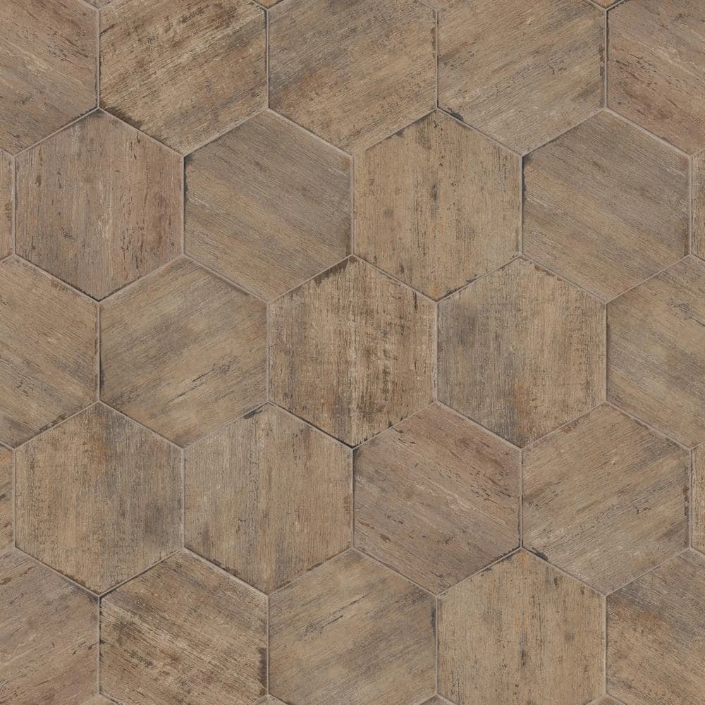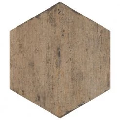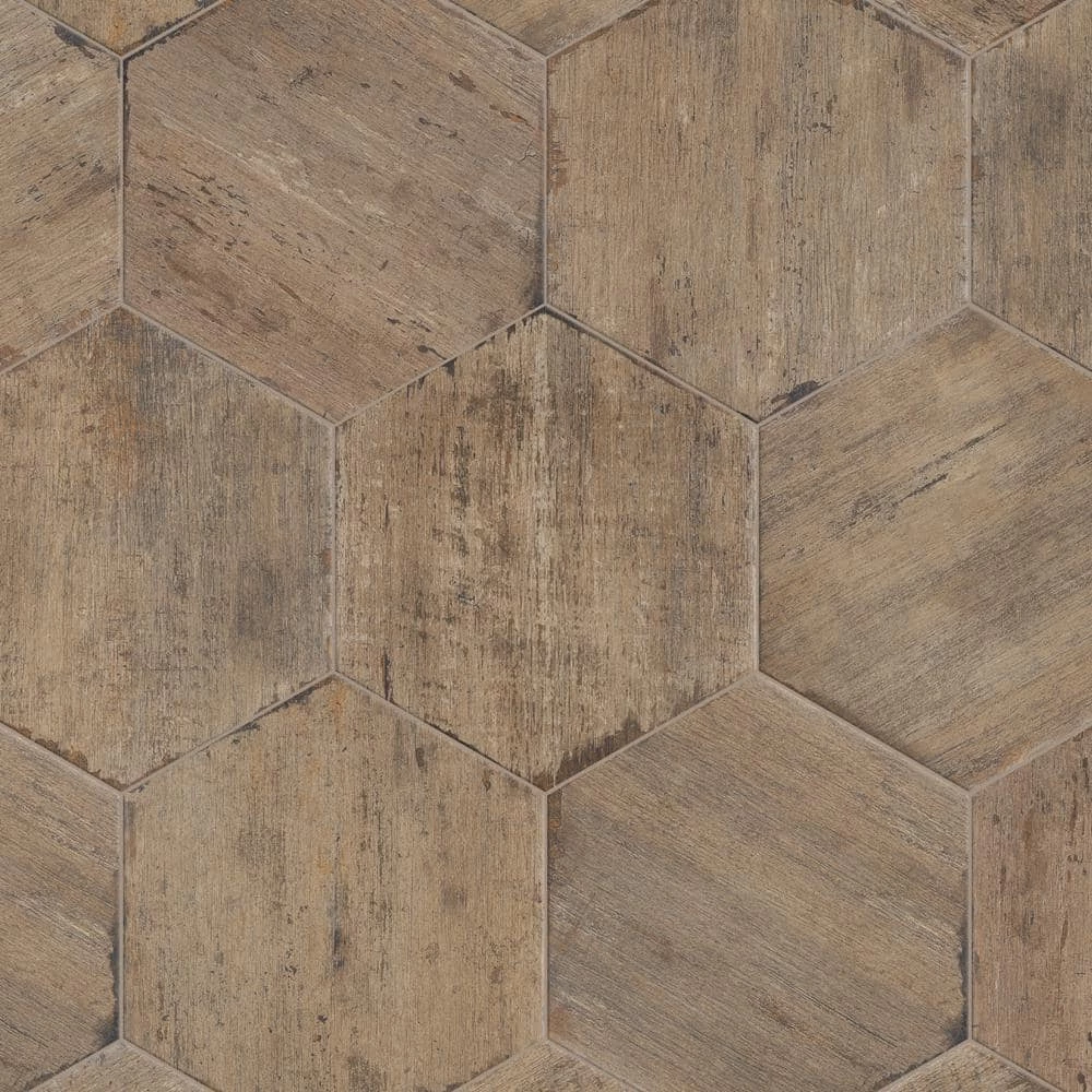 The Merola Tile Retro Hex Terra 14-1/8 in. x 16-1/4 in. Porcelain Floor and Wall Tile is a breathtaking addition to our collection of wood-look tiles. Crafted in Spain, the combination walnut and chestnut glaze features a meticulously detailed grain accented in cedar. To add further contrast and depth, this tile has subtle bumps and grooves that echo the texture of real wood. The finishing touch on this hexagon is the imitations of scuffs and spots, which gives this tile an antiquated appearance reminiscent of distressed painted wood. This extruded porcelain tile has 12 different print variations for a one-of-a-kind look that can only be achieved through the partially handmade process. You have the ability to create endless design possibilities when you pair this with other products in the Retro series. This impervious, matte tile will look great in all indoor and outdoor locations, including walls, floors, and patios.