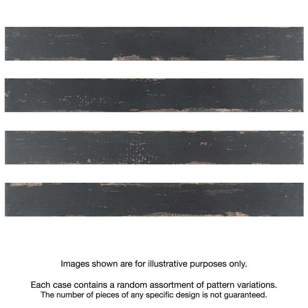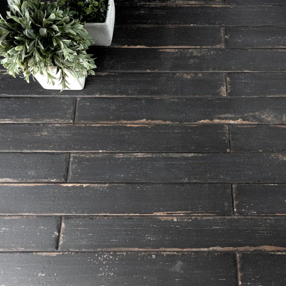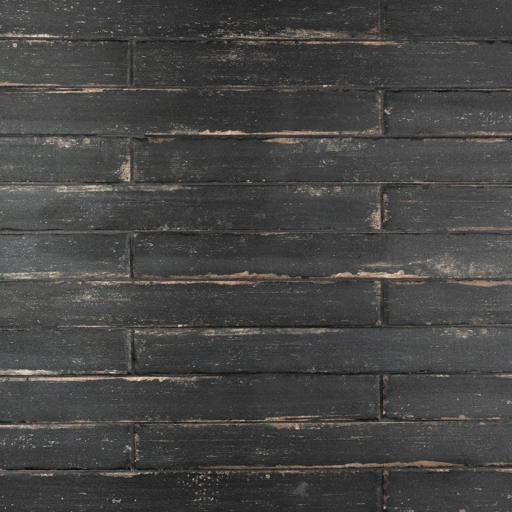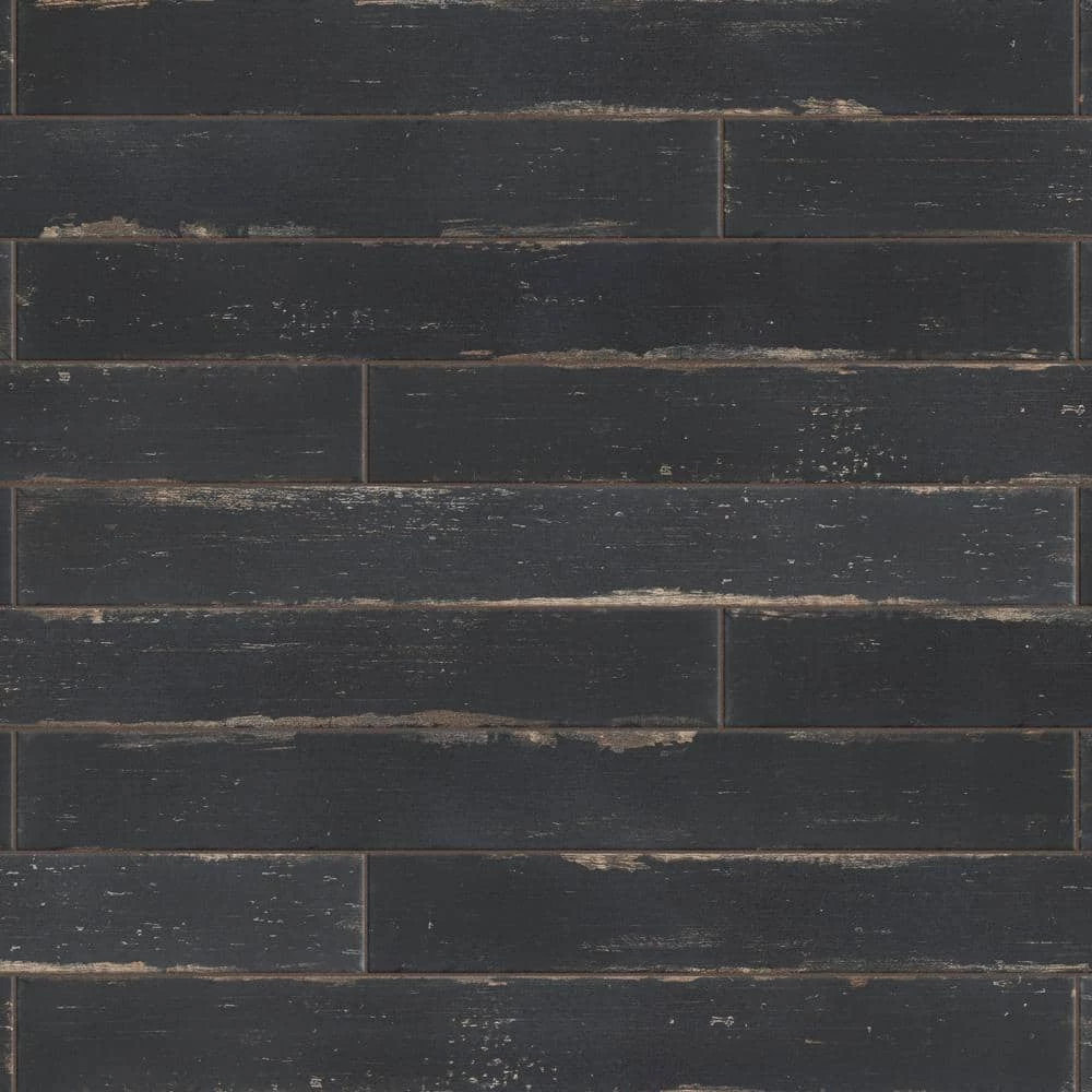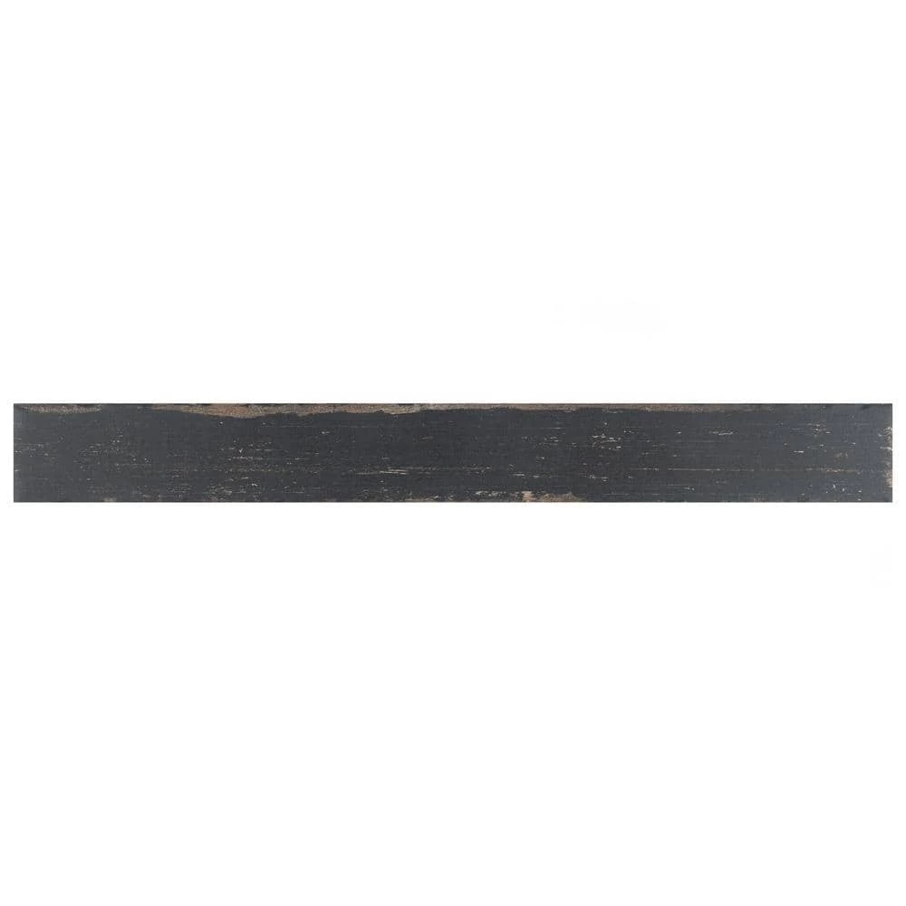 The Merola Tile Retro Nero 2-3/4 in. x 23-1/2 in. Porcelain Floor and Wall Tile is a breathtaking addition to our collection of wood-look tiles. Crafted in Spain, the soot black glaze features a meticulously detailed grain accented in shades of tan. To add further contrast and depth, this tile has subtle bumps and grooves that echo the texture of real wood. The finishing touch on this small plank is the imitations of scuffs and spots, which gives this tile an antiquated appearance reminiscent of distressed painted wood. This extruded porcelain tile has 12 different print variations for a one-of-a-kind look that can only be achieved through the partially handmade process. You have the ability to create endless design possibilities when you pair this with other products in the Retro series. This impervious, matte tile will look great in all indoor and outdoor locations, including walls, floors, and patios.