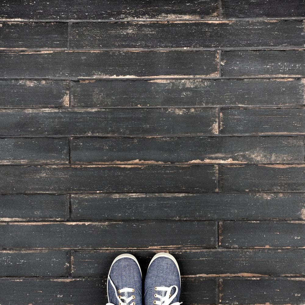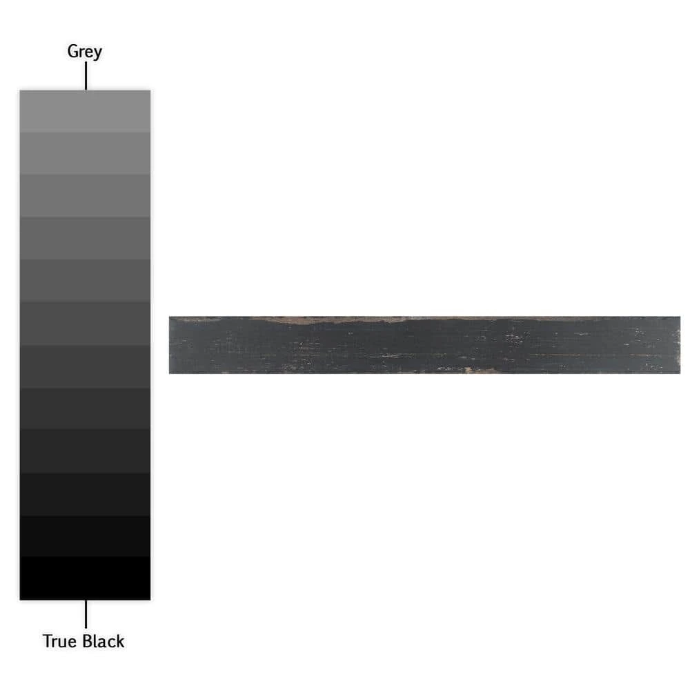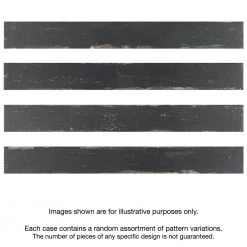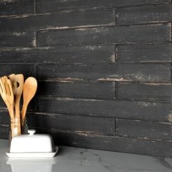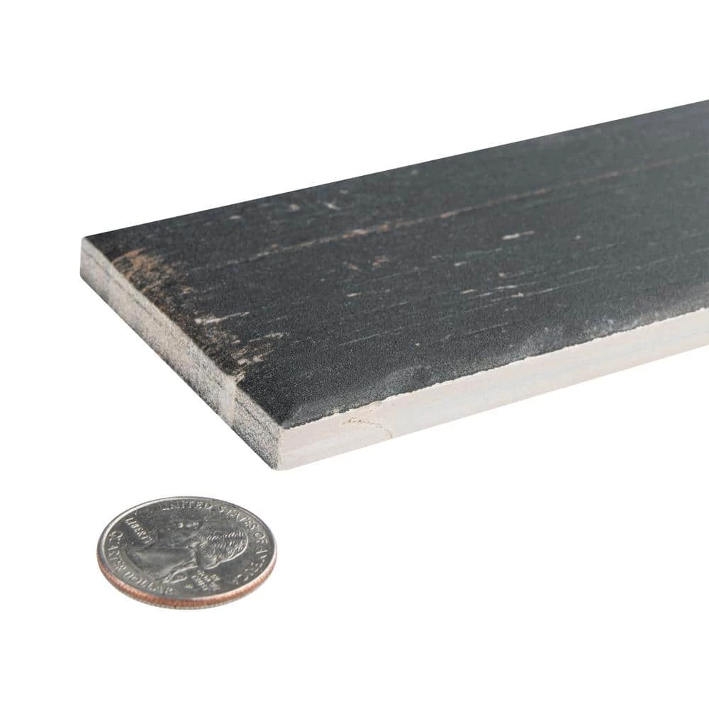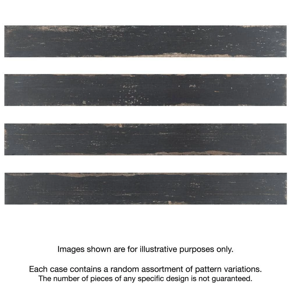The Merola Tile Retro Nero 2-3/4 in. x 23-1/2 in. Porcelain Floor and Wall Tile is a breathtaking addition to our collection of wood-look tiles. Crafted in Spain, the soot black glaze features a meticulously detailed grain accented in shades of tan. To add further contrast and depth, this tile has subtle bumps and grooves that echo the texture of real wood. The finishing touch on this small plank is the imitations of scuffs and spots, which gives this tile an antiquated appearance reminiscent of distressed painted wood. This extruded porcelain tile has 12 different print variations for a one-of-a-kind look that can only be achieved through the partially handmade process. You have the ability to create endless design possibilities when you pair this with other products in the Retro series. This impervious, matte tile will look great in all indoor and outdoor locations, including walls, floors, and patios.