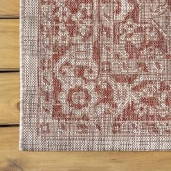 This ornate medallion rug’s lively pattern adds dreamy Bohemian style to an outdoor porch or patio. Varied tones of taupe mingled with a rusty-red pattern give this rug a hand-woven, vintage vibe. The flatweave design is great for high-traffic spaces indoors too.