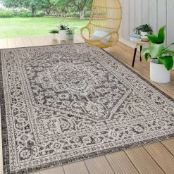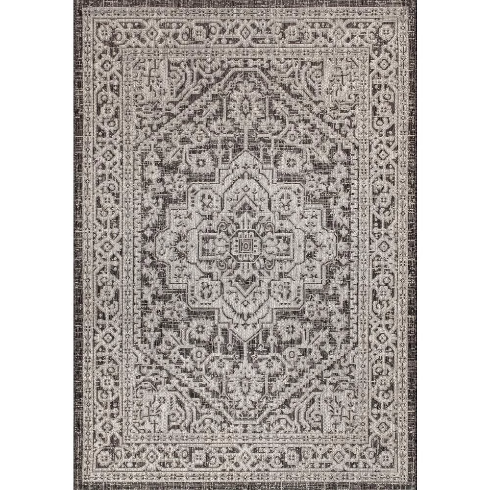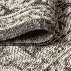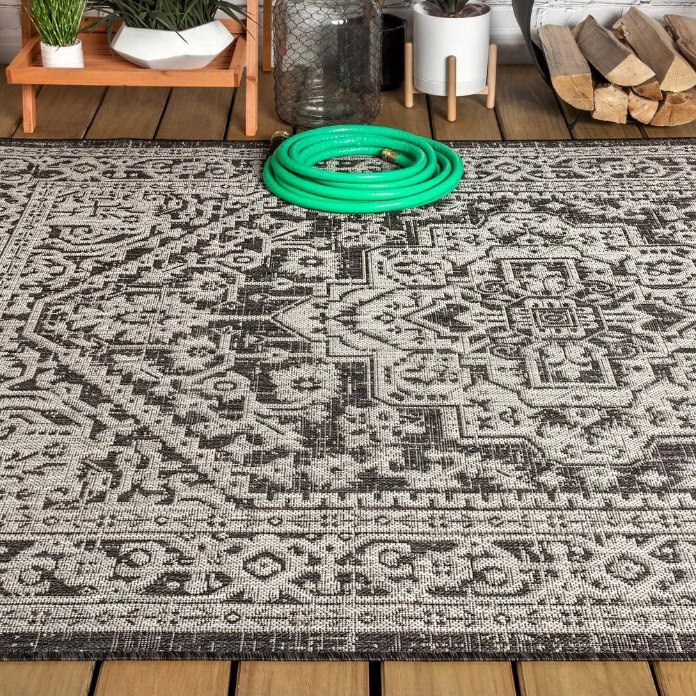 This ornate medallion rug’s lively pattern adds exotic style to an outdoor porch or patio. Varied tones of light gray mingled with a black pattern give this rug a hand-woven, vintage vibe. The flatweave design is great for high-traffic spaces indoors too.
