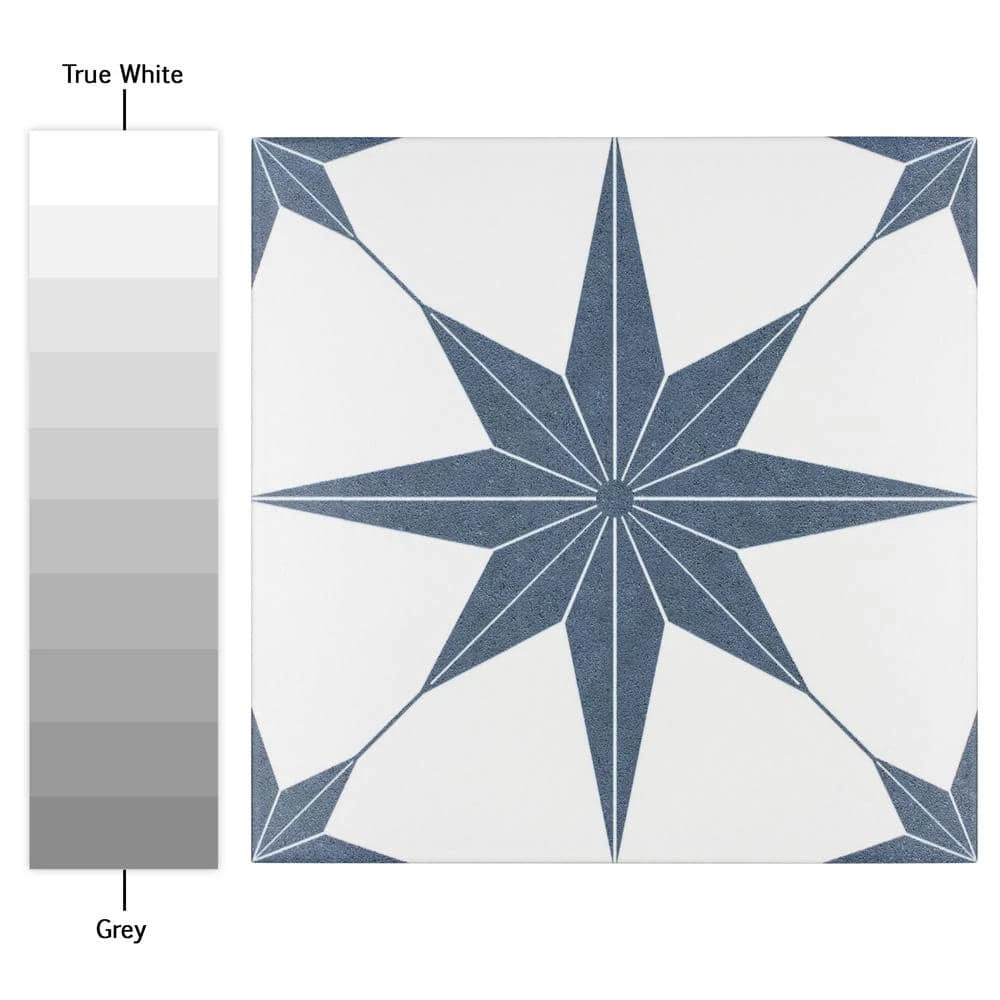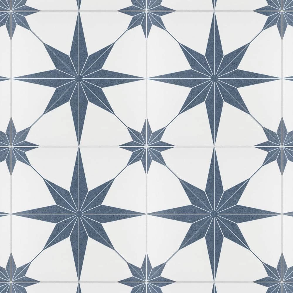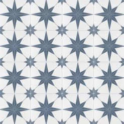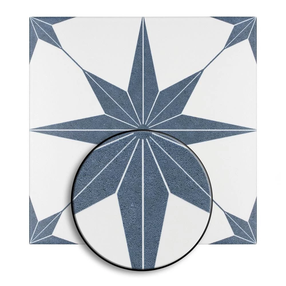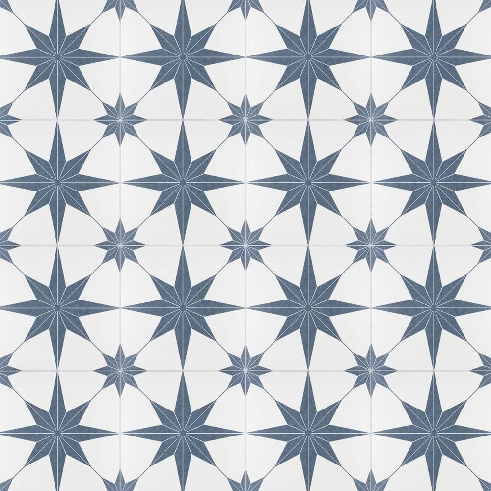 Classic meets modern with the Merola Tile Stella Azul 9-3/4 in. x 9-3/4 in. Porcelain Floor and Wall Tile. Bluish-grey and chalky white tones highlight a star created from geometric shapes at the center for an old-world European look. Impervious and frost resistant, it is perfect for use in indoor and outdoor settings. This stylish heavy-duty tile is also made from natural ingredients and contains no allergens, VOCs, formaldehyde or PVC.
