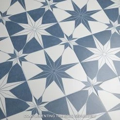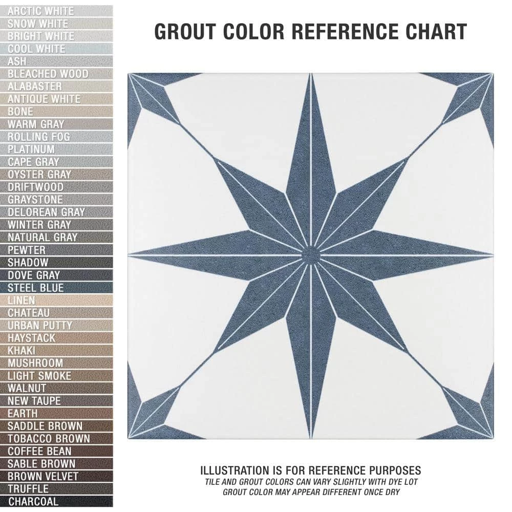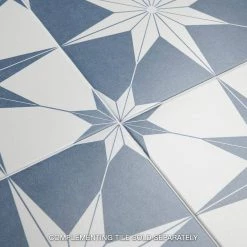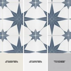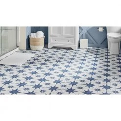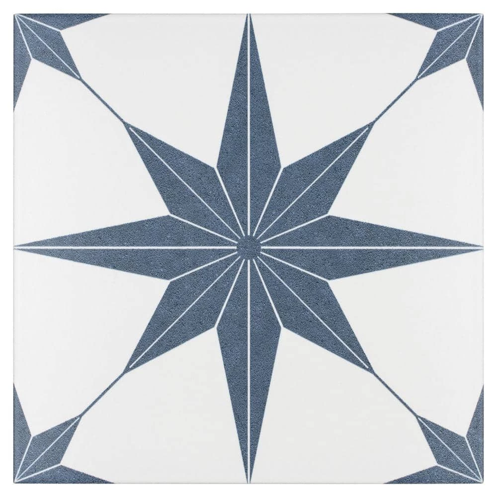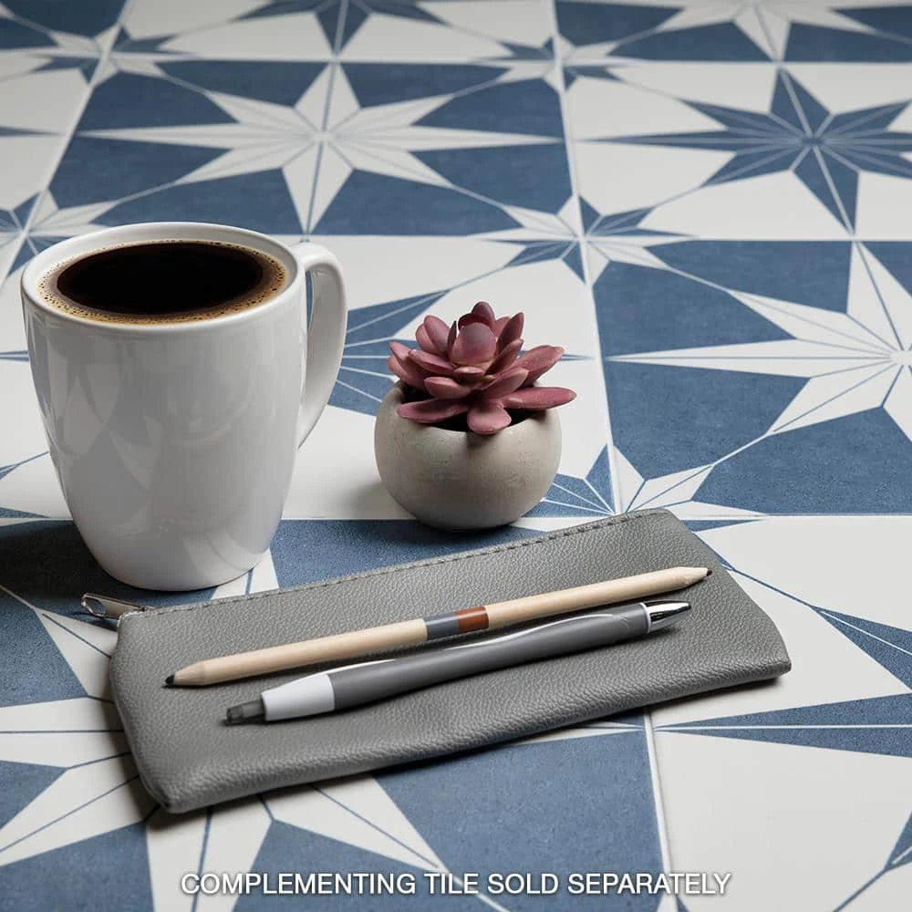 Classic meets modern with the Merola Tile Stella Azul 9-3/4 in. x 9-3/4 in. Porcelain Floor and Wall Tile. Bluish-grey and chalky white tones highlight a star created from geometric shapes at the center for an old-world European look. Impervious and frost resistant, it is perfect for use in indoor and outdoor settings. This stylish heavy-duty tile is also made from natural ingredients and contains no allergens, VOCs, formaldehyde or PVC.