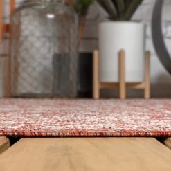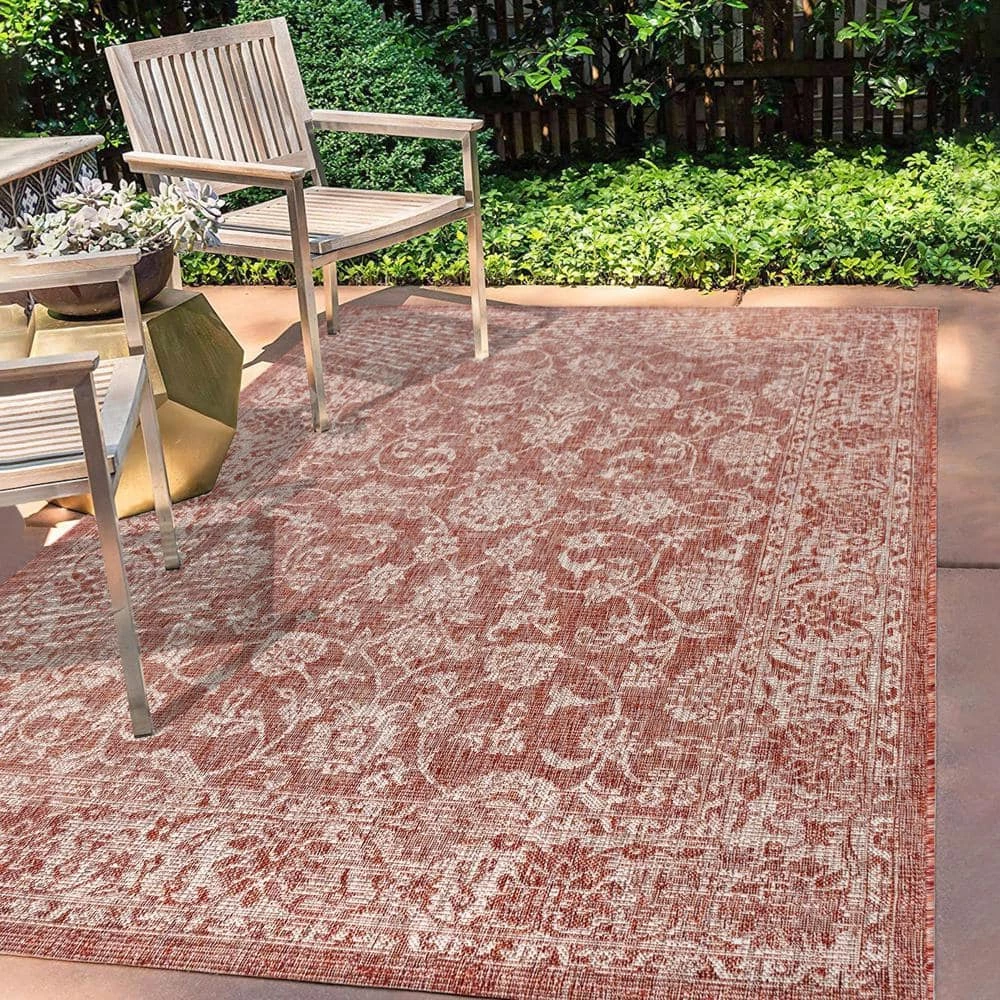 With a vine-and-border design inspired by Persian rugs, our Boho-chic rug adds eclectic style to an outdoor porch or patio. Varied tones of red and rust mingled with a taupe pattern give this rug a hand-woven, vintage vibe. The flatweave design is great for high-traffic spaces indoors too.