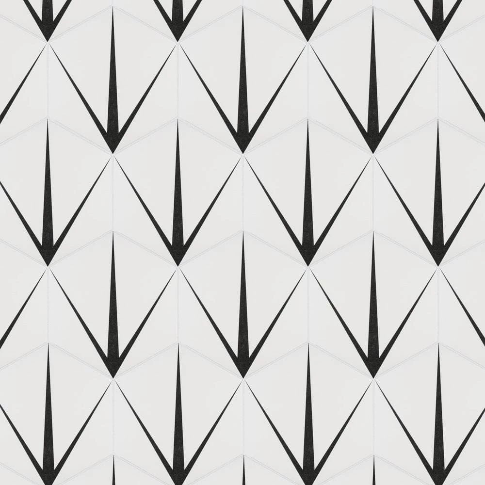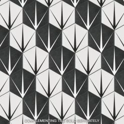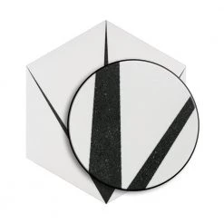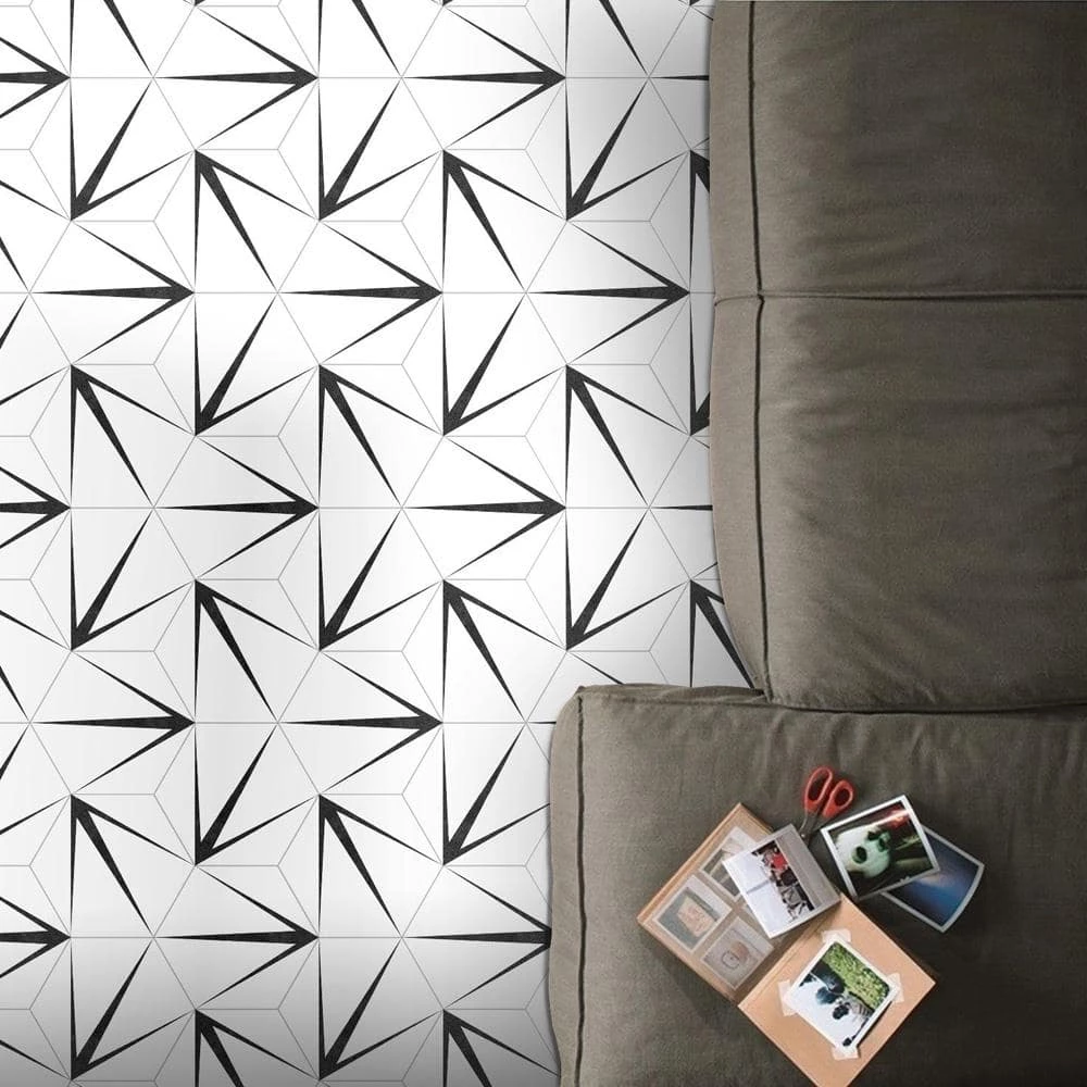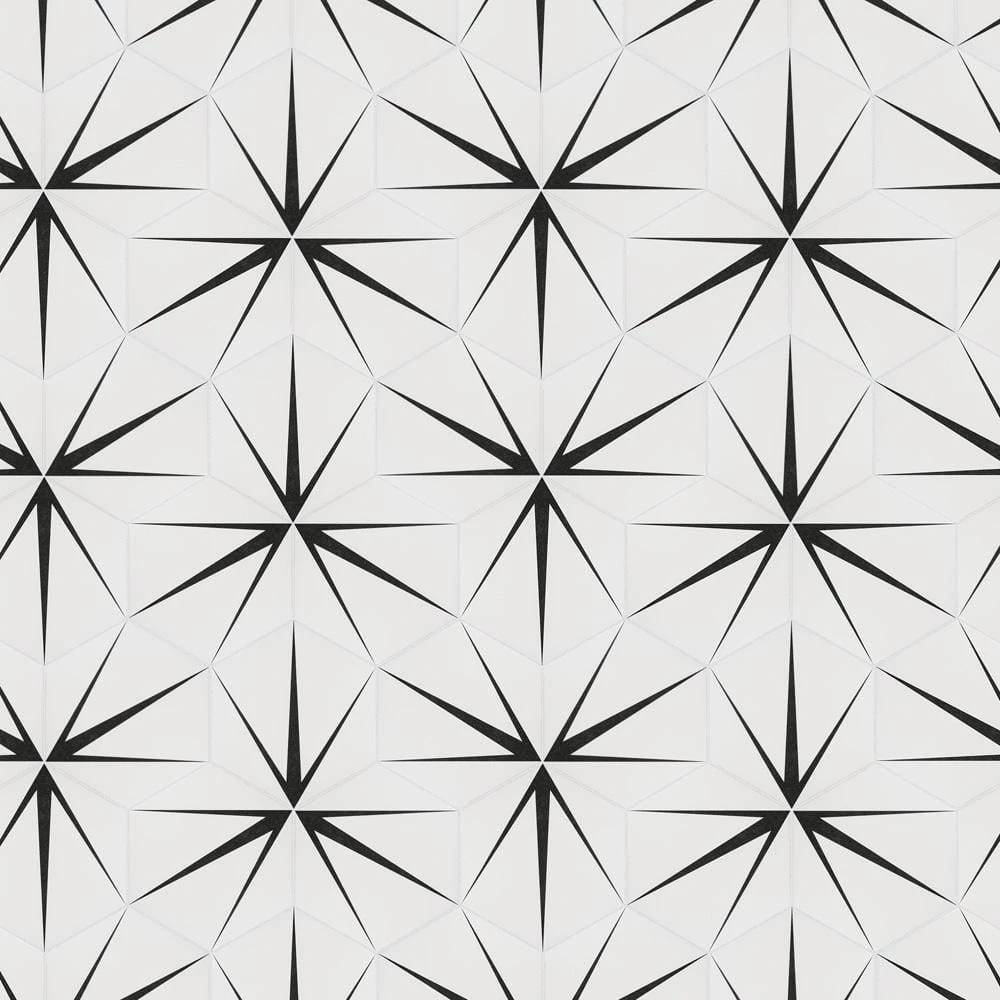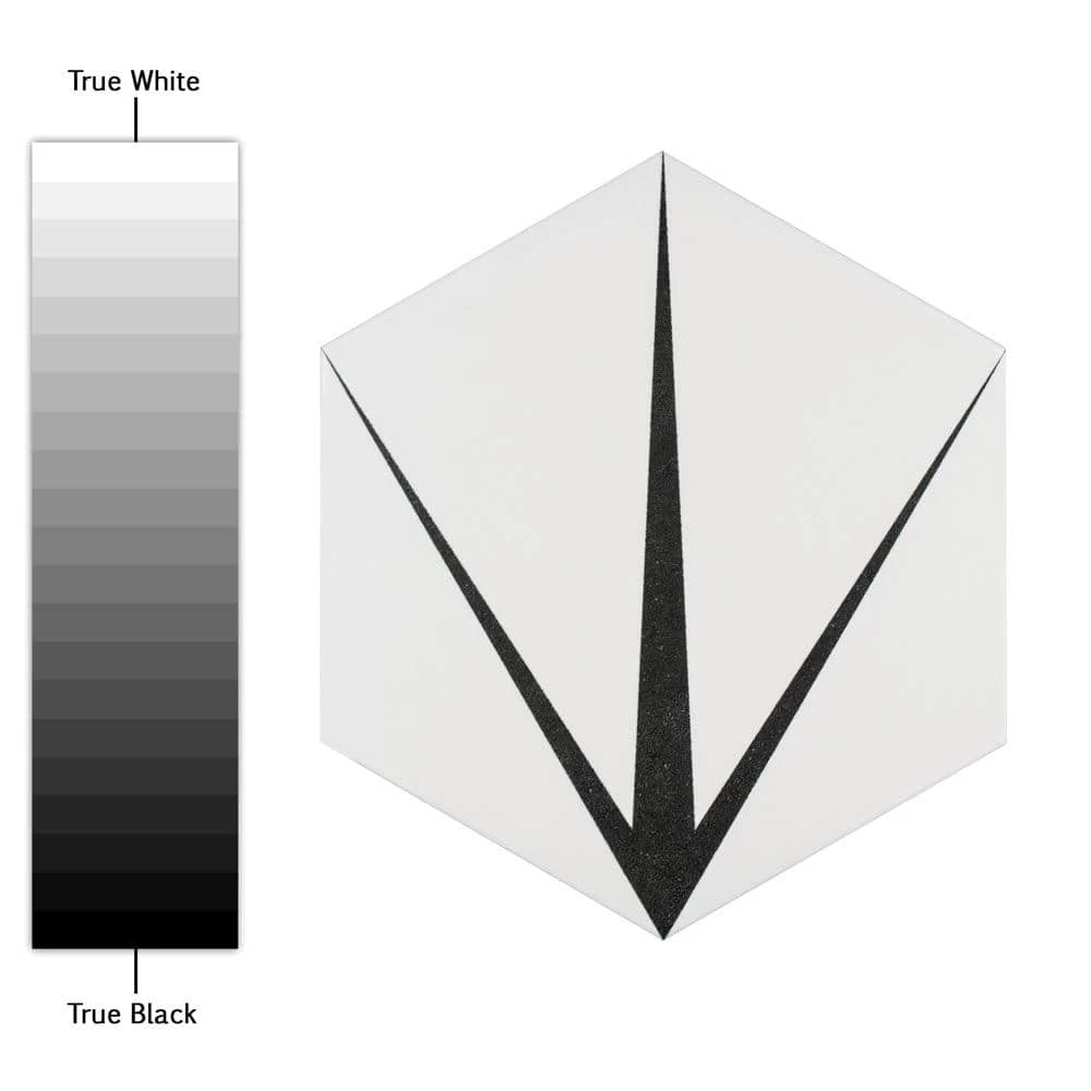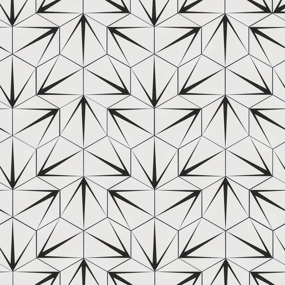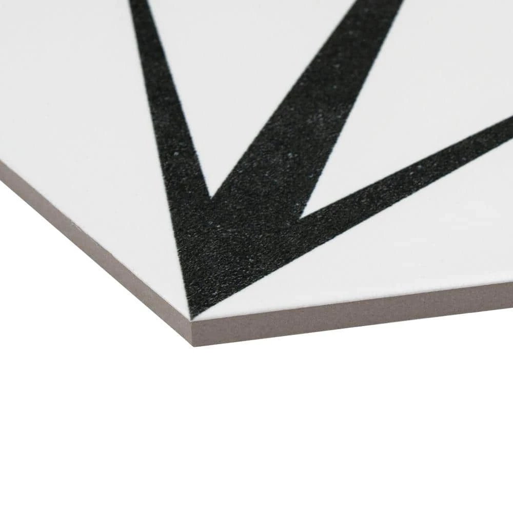 The Merola Tile Trident Hex Blanco Encaustic 8-5/8 in. x 9-7/8 in. Porcelain Floor and Wall Tile features a bright white color tone accented with muted black lines extending across the tile. This mesmerizing tile pattern is sure to liven up your space and give it a modern spin. Its geometric shape is unique yet simplistic enough to integrate into any design, ranging from traditional style renovations to modern home projects. The medium-sheen glazed surface offers a sleek look that adds extra character to this unique artistic tile. Its impervious and frost resistant features make this an ideal tile for both indoor and outdoor use, including backsplashes, bathrooms, and kitchens. This tile is a perfect choice on its own or coordinate with other products in the Trident series. Tile is the better choice for your space. This tile is made from natural ingredients, making it a healthy choice as it is free from allergens, VOCs, formaldehyde and PVC.
