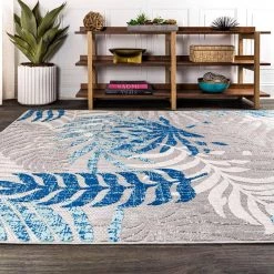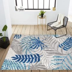 Whether you live in a tropical beach retreat or just love jungalow style, the allover palm frond pattern of this rug brings the jungle home. Overlapping palm tree branches create a rich pattern of navy, aqua and khaki tones. The pet-friendly and kid-proof flatweave design makes it easy to clean.
