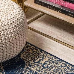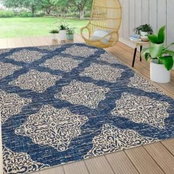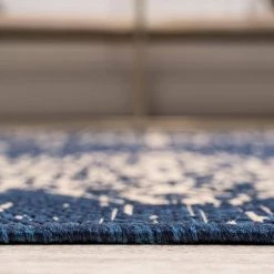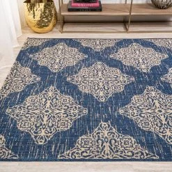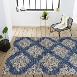 Inspired by the tile floors of Italy, this indoor/outdoor rug adds elegant pattern to your porch, patio or sunroom. Ogee-curved medallions woven in ivory add graphic punch to a deep navy background. Mingled threads give this pattern a handwoven, vintage vibe that’s perfect for an entry, kitchen, hallway, living room or bedroom too. The pet-friendly and kid-proof flatweave design makes it easy to clean, and perfect for the beach house.