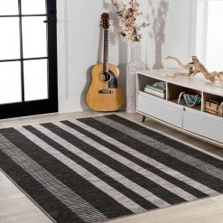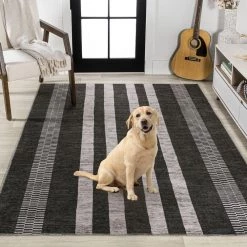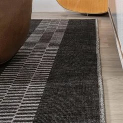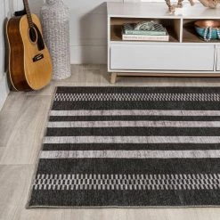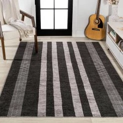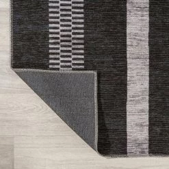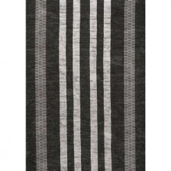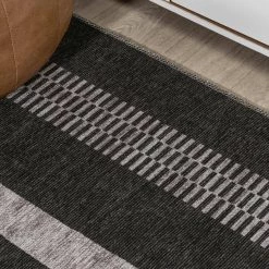 Our striped rug’s geometric details add modern style to your mid-century ranch, farmhouse or city loft. The wide woven stripes have rectangular elements that add to the handcrafted look. This durable, machine washable rug adds graphic punch to a living room, dining room, bedroom, or kitchen.