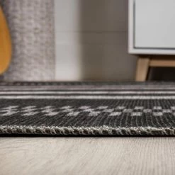 - Charcoal background has geometric designs in mingled ivory fibers for a handwoven effect