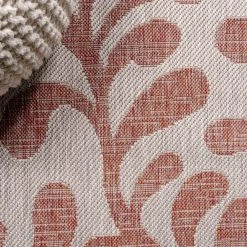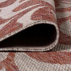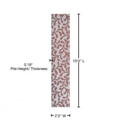 A traditional scrolling vine pattern gives this indoor-outdoor rug a classic look that’s ideal for porch or patio. Neutral red and beige tones are ideal for a living room, kitchen, family room, dining room, or bedroom. Soft, durable synthetic fibers are an easy maintenance solution for homes with kids and pets.